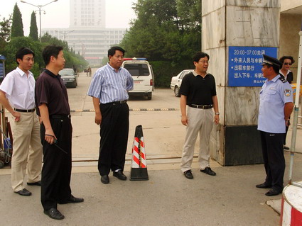 孟书记对在场的工作人员和门卫讲,目前我市和学校的奥运安保工作任务非常繁重,校门作为我校的一个形象窗口和进入校园的第一道关口,做好校门的检查和管理是维护学校安全稳定的重要工作,学校的门卫工作是光荣而又艰巨的。孟书记对门卫在进出人员和车辆的检查中认真负责的态度给予了充分的肯定和表扬,并现场建议今后要长期坚持目前的这种管理模式,门卫表示决不辜负校领导和广大师生的期望,坚决完成任务,为维护学校的安全稳定贡献力量。