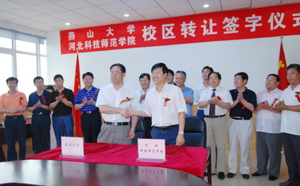 【新闻中心讯】2008年7月8日,燕山大学向河北科技师范学院转让北校区签字仪式在河北科技师范学院举行。出席签字仪式的双方学校领导有燕山大学党委书记孟卫东、校长刘宏民、副校长刘彬,河北科技师范学院党委书记石千峰、院长汤生玲、副院长孟令臣,双方转让校区领导小组其他成员一并见证了协议签字仪式。燕山大学校长刘宏民、河北科技师范学院院长汤生玲分别代表双方学校在协议书上签字。