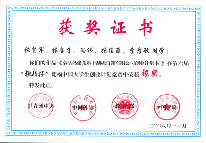燕山大学创业团队由5名学生组成,他们分别是电气工程学院研究生张贺军、文法学院行政管理专业研究生张玺才、里仁学院公共事业管理专业学生张佳菲和冯伟、经管学院会计专业学生李彦敏。他们提交的“秦皇岛建龙重卡刮板自卸有限责任公司创业计划书”,在经历了预赛、复赛后,最终闯入了决赛,与来自全国118所高校的168件作品角逐金、银奖。
