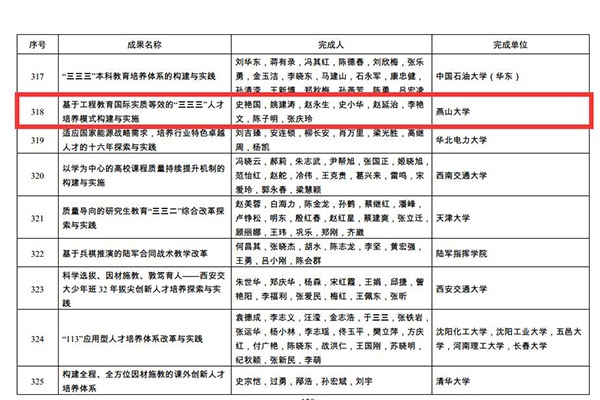 这是进入新世纪以来我校首次获得的国家级教学成果奖,是对我校十余年来开展CDIO工程教育改革和基于OBE理念的教学改革的肯定,是对燕大人多年来踏实教学改革的认可,更是对燕大校师生继续奋勇前行的一种鼓舞。