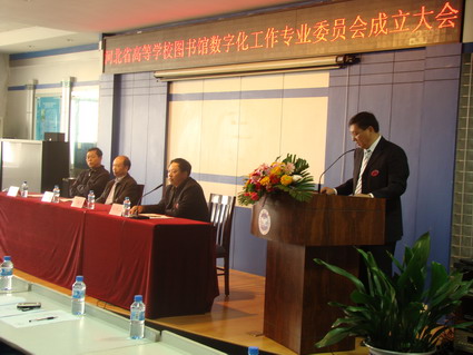 会议由杜凤山馆长主持。河北省高等学校图书情报工作委员会副主任兼秘书长杨华致开幕词,他指出:河北省高等学校图书馆数字化工作专业委员会的成立是河北省高校图书馆界的一大喜事,标志着我省高校图书馆数字化建设已经走上了有组织,有计划,有目的的发展建设阶段。