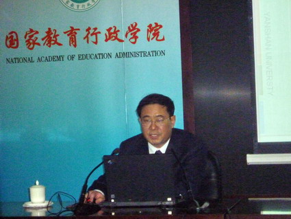 【新闻中心讯】2010年3月11日下午,刘宏民校长应国家教育行政学院邀请,为第36期“高校领导干部进修班”作报告。这是国家教育行政学院继2009年9月17日之后第二次邀请刘宏民校长作报告。第36期“高校领导干部进修班”学员主要为教育部直属高校、相关部委所属高校及地方普通高校现任副校长级以上领导干部,共约120人。