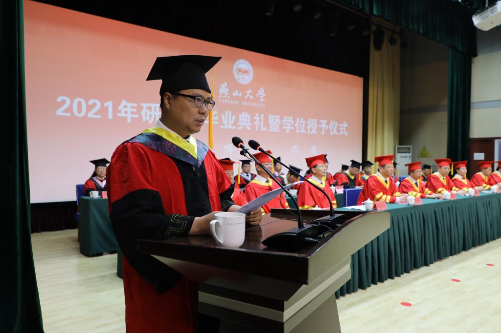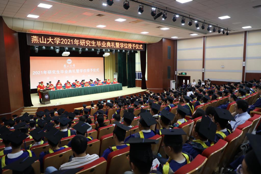 【新闻中心讯】6月27日上午,燕山大学2021年研究生毕业典礼暨学位授予仪式在西校区大学生活动中心举行。赵险峰、赵丁选、谢延安、李榕、赵永生、王宝诚、任家东、张立峰、黄传真等校领导和相关学院负责人出席了学位授予仪式。仪式由研究生院院长卢辉斌主持。