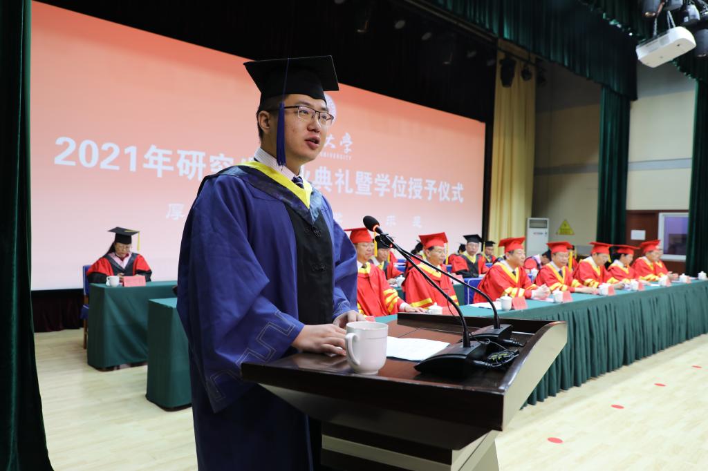 毕业生代表、信息科学与工程学院硕士生胡淇伟在仪式上发言