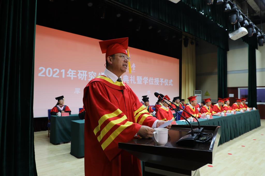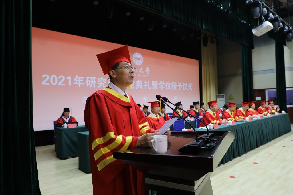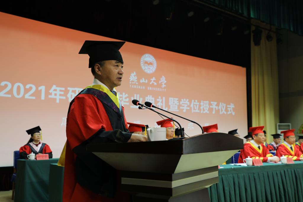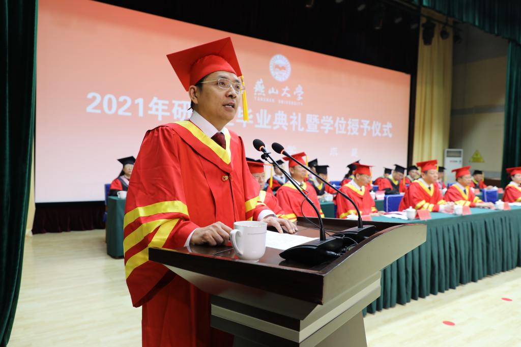 校长赵丁选代表学校向获得博士学位的145名同学和获得硕士学位的2568名同学表示热烈的祝贺,并向一路培育他们成才的老师和家长们致以衷心的感谢。赵丁选作了题为《放飞报国理想 勇担复兴大任》的讲话,他表示在大家攻读博士、硕士学位的这几年是学校建设史上发展最快的时期,几年来,学校在高层次人才队伍建设、科学研究、学科建设、人才培养等方面都取得了优异成绩,并隆重举办了百年校庆,这些重大事件都充分展现了燕大人的奋斗基因、工匠精神、卓越品质和家国情怀。站在“两个一百年”的历史交汇点,置身于“两个大局”之中,在迎接中国共产党建党百年华诞之际,赵丁选对即将迈出校园的毕业生们提出三点殷切希望:志存高远,为中华民族伟大复兴努力奋斗,带上“厚德、博学、求是”的校训精神和“百年燕大,家国天下”的铮铮誓言,走向社会去放飞梦想,在民族复兴的伟业中实现个人价值;勇于创新,为国家科技自立自强贡献聪明才智,以与时俱进的精神、革故鼎新的勇气、坚韧不拔的定力争当国家科技自主创新的弄潮儿,为建成世界科技强国贡献燕大学子的力量;注重实效,将理论成果转化为改变世界的力量,躬身实践,学以致用,把书本上的理论变成国家所急需的关键核心技术,把科技成果应用在实现现代化的伟大事业中。最后,赵丁选以一句优美的词句“镜湖鱼影,塔山鸟鸣,送君去;宏桥雨落,幽径花开,等君还!”结束精彩的发言。