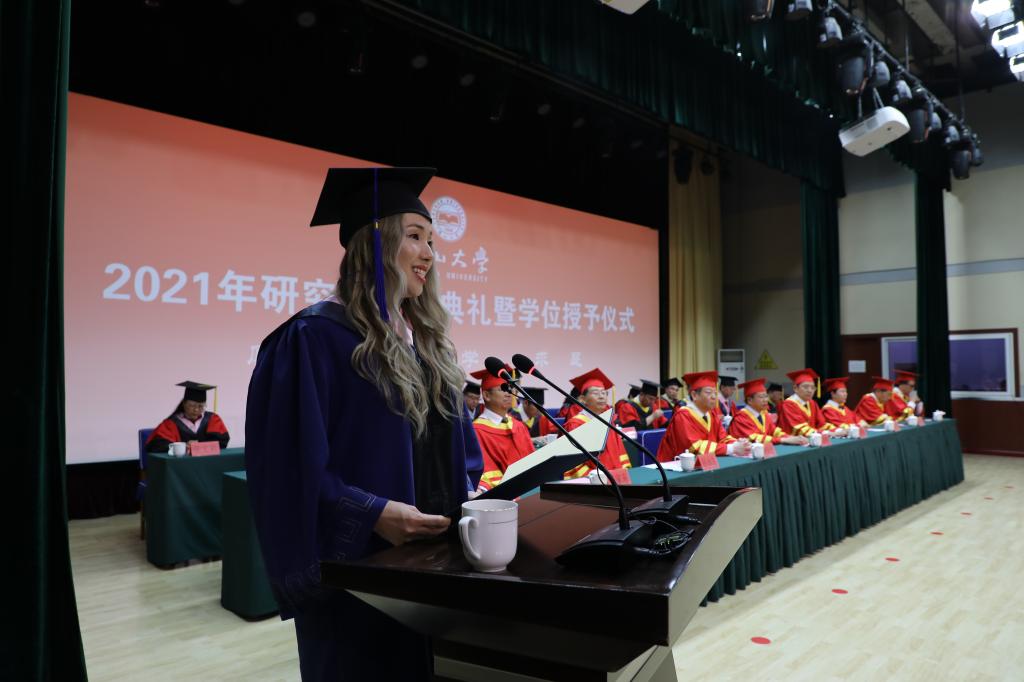 毕业留学生代表、文法学院硕士留学生胡兰在仪式上发言