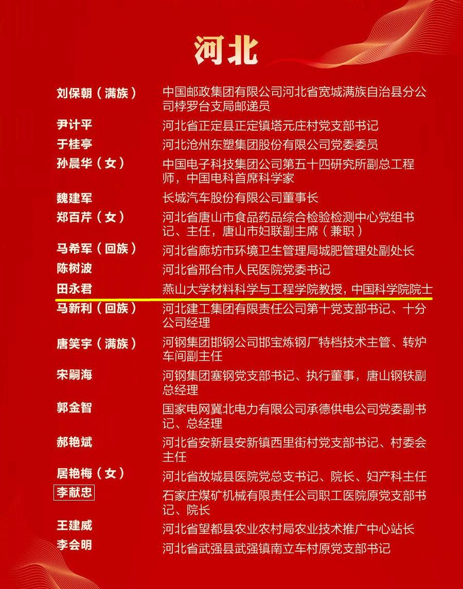 田永君,1963年3月生,1983年6月加入中国共产党,1987年6月参加工作,是中国科学院院士、第十三届全国人大代表、燕山大学材料科学与工程学院教授、博士生导师。田永君同志紧紧把握国家重大科技需求,专注超硬材料科学研究,啃下一个又一个硬骨头,取得了多项原创成果,以实际行动诠释了一名新时代高校教师党员的报国情怀与奉献担当,为助力实现科技自立自强作出重要贡献。他甘为人梯传承薪火,躬身高水平创新创造人才培养,带头建成了全省首个国家重点实验室,引育了以“长江学者奖励计划”特聘教授、国家杰出青年科学基金获得者等为乐竞体育在线带头人的科研团队,入选全国专业技术人才先进集体。