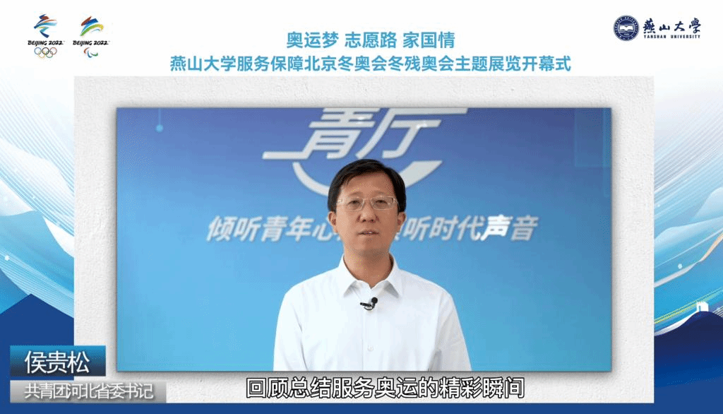 侯贵松在视频致辞中指出,此次主题展览是教育引领广大团员青年喜迎二十大、永远跟党走、奋进新征程的重要载体,是弘扬北京冬奥精神、志愿精神的重要举措。他希望,燕山大学广大青年师生以此次活动为契机,进一步深刻学习领会习近平总书记在庆祝建团百年大会上提出的“五个模范、五个带头”的成长指引,努力成长为堪当民族复兴重任的时代新人。