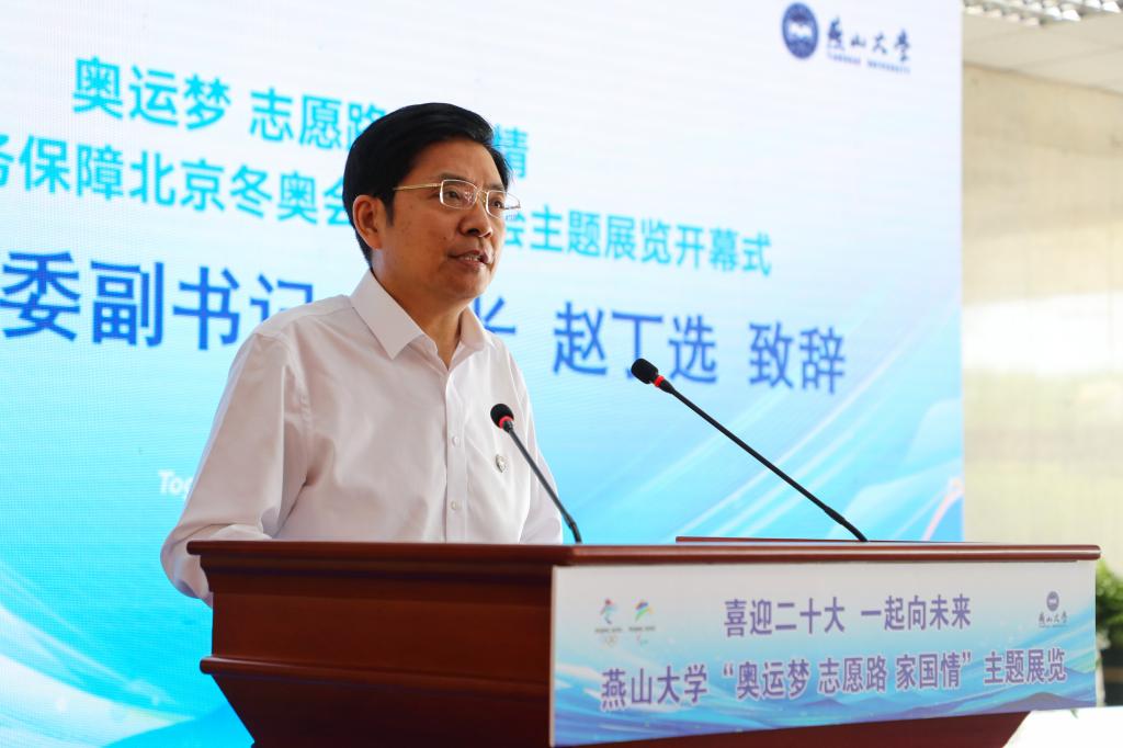 赵丁选在开幕式致辞中对河北省和秦皇岛市有关部门长期以来对学校事业发展的关心帮助与鼎力支持表示衷心感谢。他指出,依托秦皇岛市独特的地理优势和丰富的体育文化资源,燕山大学发扬熔铸在骨子里奋斗基因、工匠精神、卓越品质和家国情怀,在国家重大体育文化盛事中从未缺席,尤其在北京冬奥会、冬残奥会服务保障工作中,交出了新时代燕大人的优异答卷。他表示,档案存凭留史、资政育人,此次主题展览生动再现了秦皇岛市和燕山大学师生服务国家重大体育赛事的历史,是校市认真贯彻落实习近平总书记对档案工作重要批示精神和在北京冬奥会、冬残奥会总结表彰大会上重要讲话精神的一次生动实践,是校市首次联合创作高质量展览,更好满足人民美好生活需要的一种有益尝试,是将冬奥遗产转化为紧扣时代脉搏的“大思政课”,让爱党爱国情怀和奥林匹克文化在校园落地生根的一个重要成果。赵丁选强调,希望以此次展览为契机,全体燕大人继续大力弘扬北京冬奥精神,践行燕大人文化品格,以实际行动和优异成绩迎接党的二十大胜利召开,为秦皇岛加快建设国际一流旅游城市、实现中华民族伟大复兴的中国梦贡献力量。