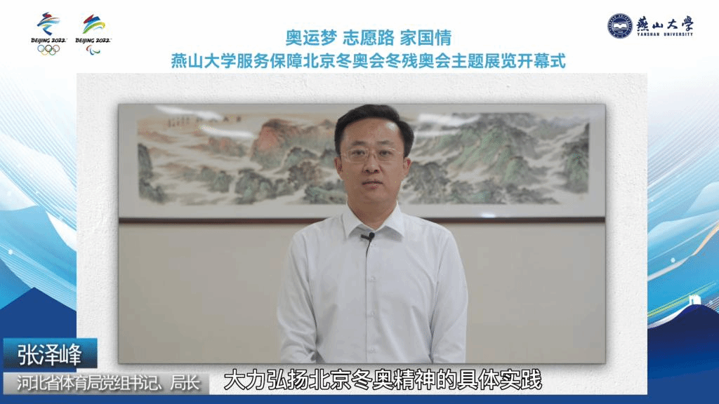 张泽峰在视频致辞中指出,长期以来,秦皇岛市和燕山大学积极响应“三亿人参与冰雪运动”的号召,扎实推动了冰雪运动的普及和发展,为河北省开启冰雪运动发展新纪元做出了重要贡献。他表示,此次主题展览是有力推进“冰雪运动进校园”的有力举措,将持续巩固和扩大“全民上冰雪”成果,为加快河北省体育运动发展和建设现代化体育强省贡献力量。