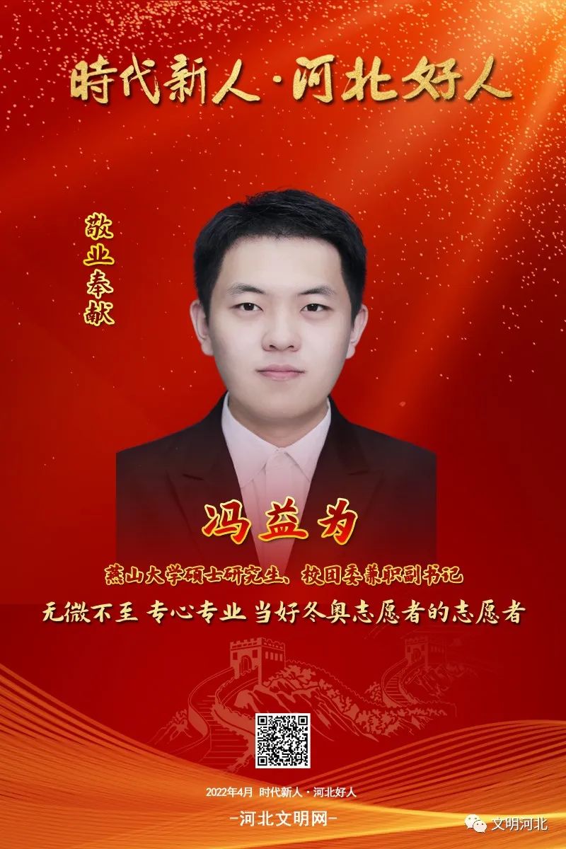 【新闻中心讯】弘扬好人精神,传递榜样力量。据“河北文明网”消息,经各地各单位推荐、网友点赞评议、评议会综合审议,4月29日,河北省文明办在“冀云·河北省道德领域先进典型网上发布厅”发布2022年4月“时代新人·河北好人”,我校经济管理学院研究生冯益为入选“河北好人榜”。这是继2019年我校环境与化学工程学院学生杜大学入选“河北好人榜”以来,我校学生第二次入选。