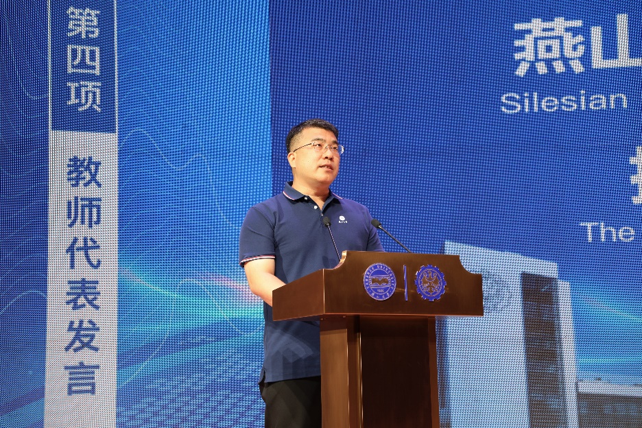 教师代表、电子科学技术专业教师刘雪强老师在发言中表示,作为专业教师,他将坚持以初心、热心、恒心对待教学,以学生为本,潜心钻研;坚持以OBE理念为指导,不断锤炼同学们分析问题、解决问题的能力。希望新生们在西里西亚智能科学与工程学院学有所得、学有所成,不负韶华、不负时代。