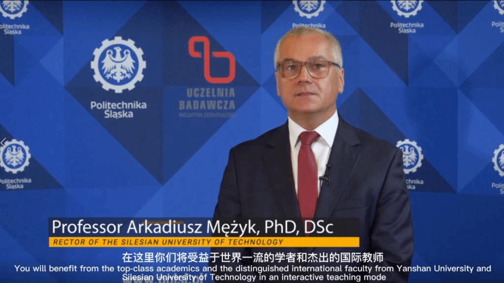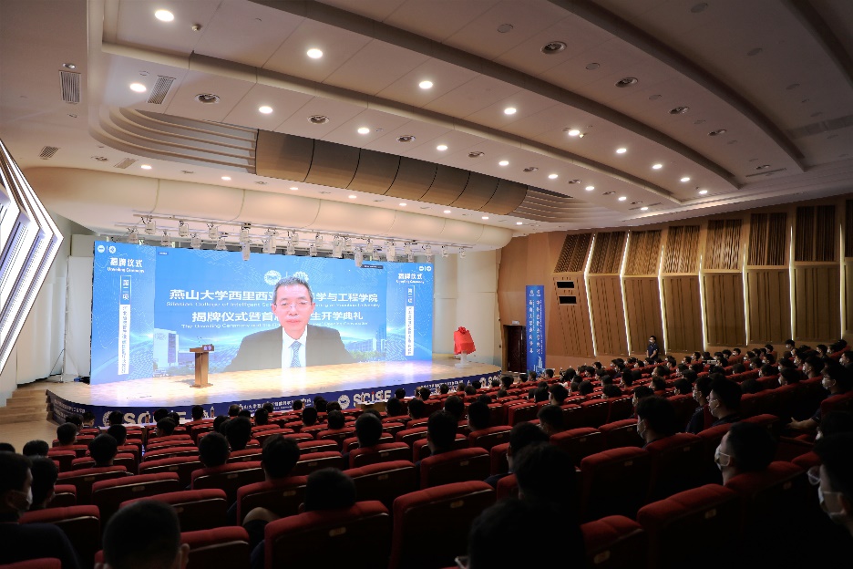 揭牌仪式结束后,举行首届本科生开学典礼。梅日克通过视频致辞,他提到,学校会为大家提供高质量的启蒙教育,学生们将受益于来自燕山大学和西里西亚技术大学的世界一流学者和杰出国际教师在机械设计制造及其自动化、自动化、软件工程、电子科学与技术领域提供的互动式教学模式。他希望学生们能够在这种合作办学模式下取得丰硕的学习成果。