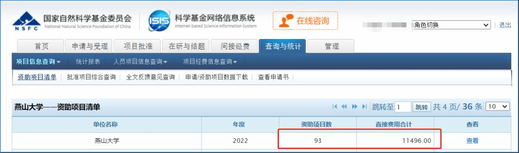 国家自然科学基金ISIS系统资助项目清单截图(图片由科学技术研究院提供)