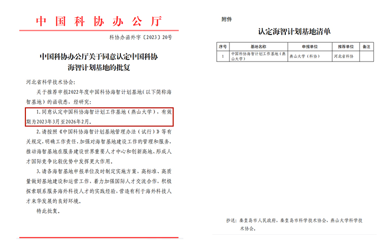 【新闻中心讯】近日,中国科学技术协会下达《关于同意认定中国科协海智计划基地的批复》(科协办函外字〔2023〕20号)文件,经过单位申报、省市推荐、审核公示、专家评审等环节,燕山大学正式获批2022年度中国科协海智计划基地。这是我校首次获批中国科协设立的国家级平台,也是河北省首所高校获批该平台,对有效发挥我校科研服务国际人才效能、提升我校国际科技合作水平具有重要意义。本次认定,河北省仅燕山大学获得批复。