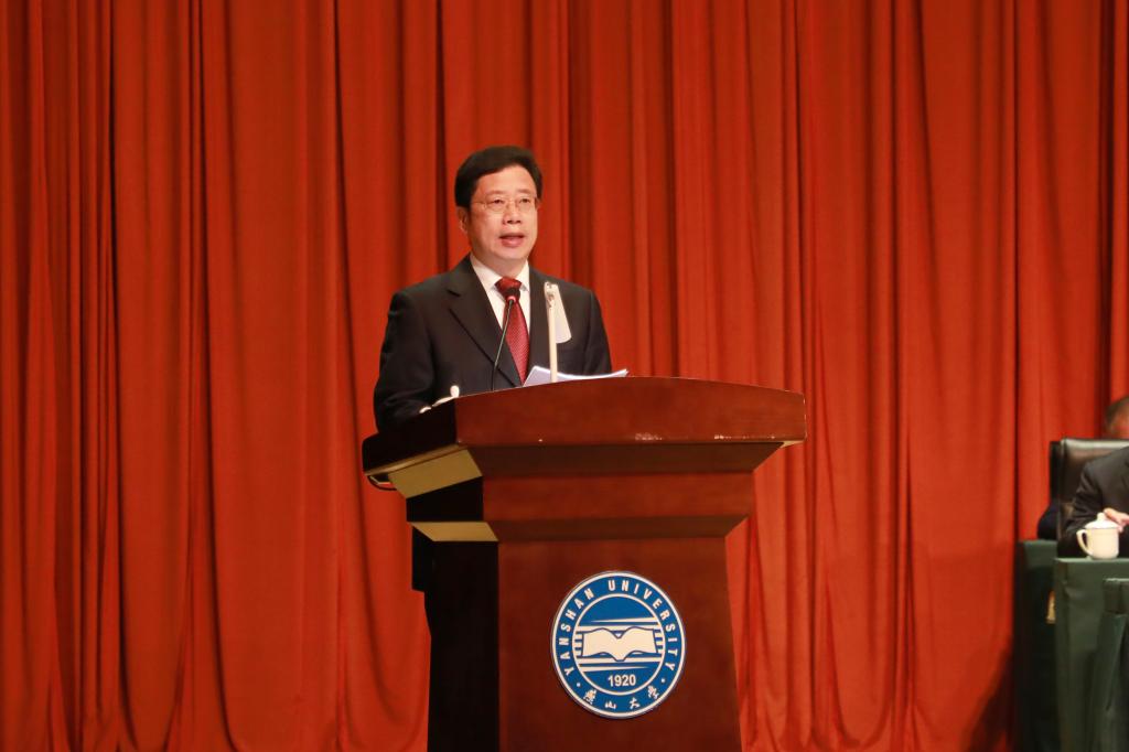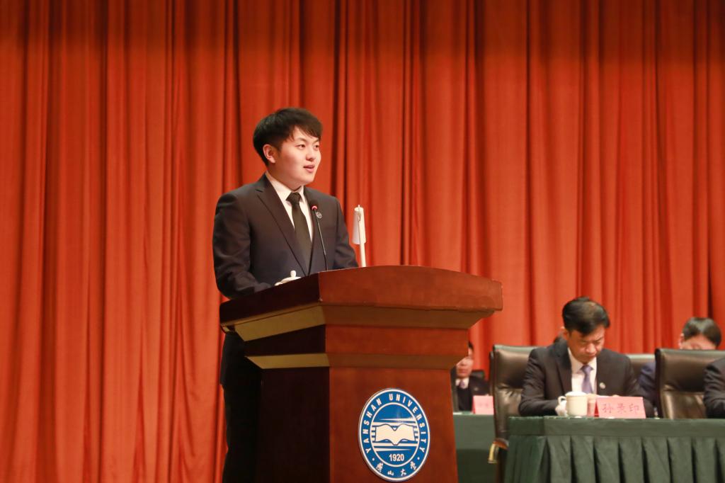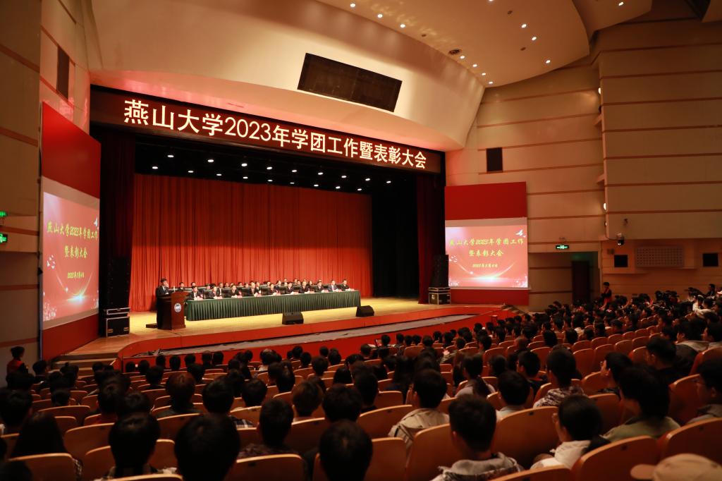 党委书记赵险峰在会上讲话。他表示,全校学团工作者和青年学子深入学习贯彻习近平新时代中国特色社会主义思想,积极响应党和国家号召,认真落实立德树人根本任务,以实际行动践行了“厚德、博学、求是”的校训精神,传承了熔铸在燕大人骨子里的奋斗基因、工匠精神、卓越品质和家国情怀,诠释了燕大人薪火相传的勇毅与担当、拼搏和斗志。他指出,要牢记习近平总书记关于加快建设教育强国、科技强国、人才强国的殷切嘱托,坚持党的教育方针,不忘立德树人初心,牢记为党育人、为国育才使命,构建“多向锻造式”大思政育人格局,以实干实绩推动中国式现代化燕大实践场景变为美好现实:一是以创新理论武装师生头脑,以初心使命回答时代之问,坚持推动党的创新理论入脑入心,坚持推动党的创新理论充盈育人空间;二是以育人合力筑牢思政体系,以坚定信念应对时代之变,激发“全员育人”主体自觉,形成“全程育人”系统合力,构建“全方位育人”多维格局;三是以斗争精神淬炼品格,以奉献担当走好时代之路,做到不忘初心、牢记使命,努力拼搏、不懈奋斗,慎思明辨、弘扬正气。他希望,各级学团组织要不断增强政治功能、组织功能,全面提升思想政治工作的主动性、精准性、实效性;广大学团工作者要切实铸牢对党绝对忠诚的政治品格,成为塑造学生品格、品行、品味的“大先生”;广大学子要永远心怀“国之大者”,让奋斗的脚步与祖国发展同向同行、同频共振。他强调,新时代的燕大属于青年,新时代的燕大依靠青年,新时代的燕大引育青年,全校学团工作者和广大青年学子要以青春之气魄,建设青春之燕大、青春之中国,在建功民族复兴伟业中书写燕山大学新的壮美篇章!
