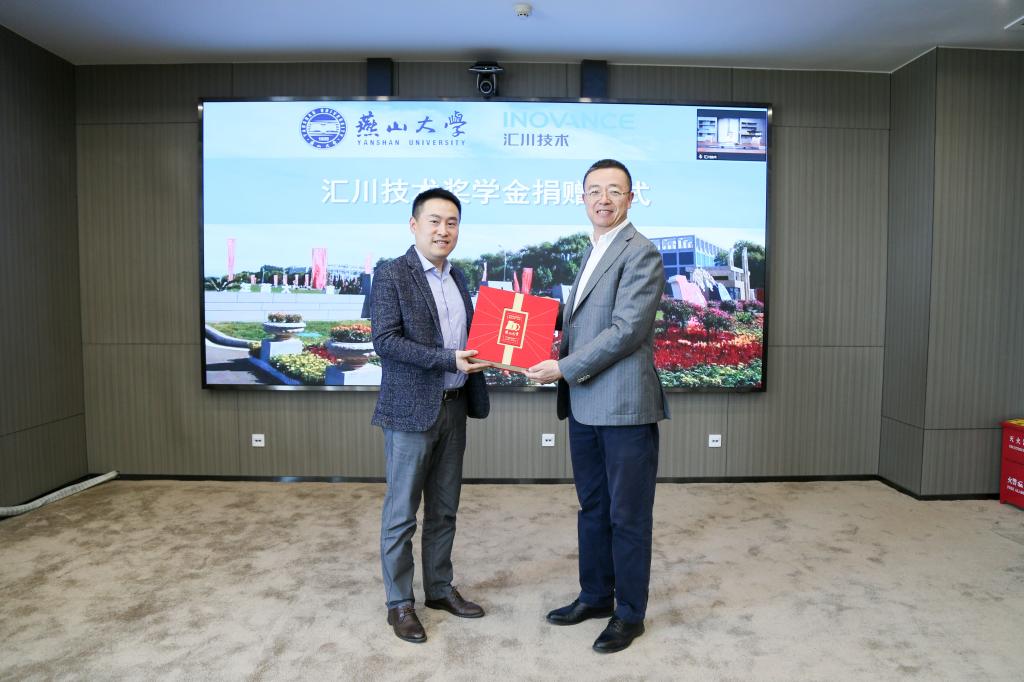 在共同见证下,任家东与苏通代表校企双方签署燕山大学—汇川技术股份有限公司战略合作协议。任家东向苏通颁发了汇川奖学金捐赠证书。