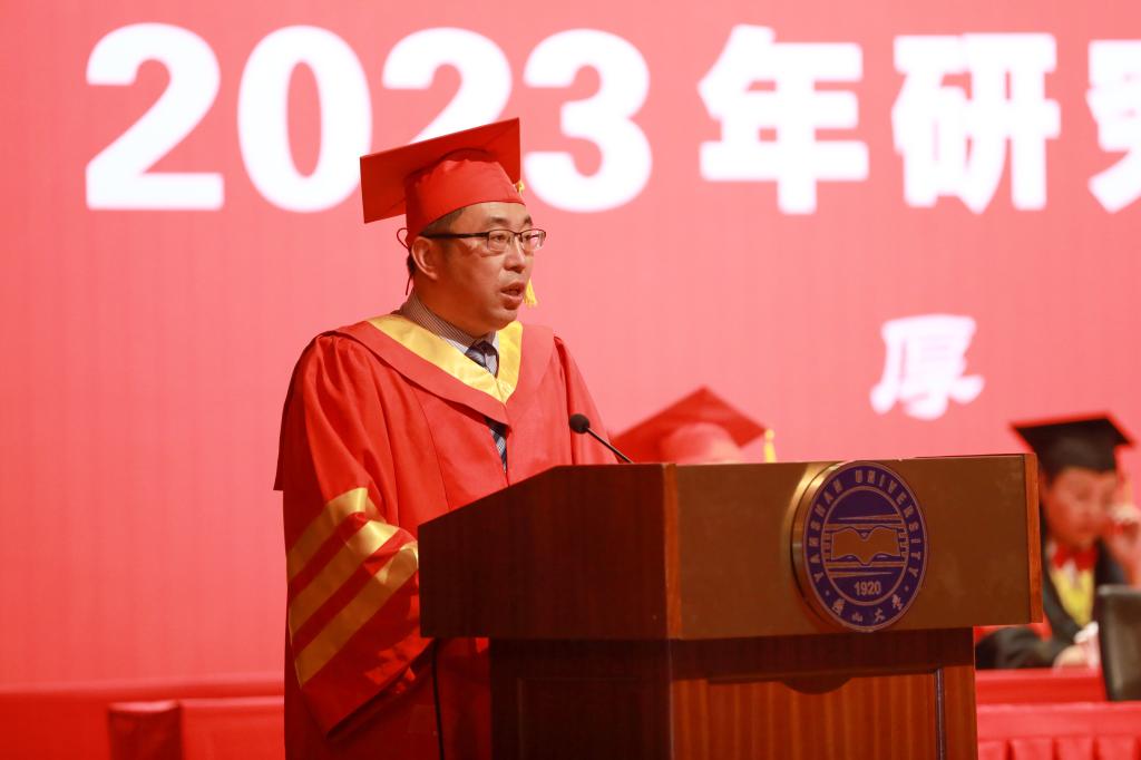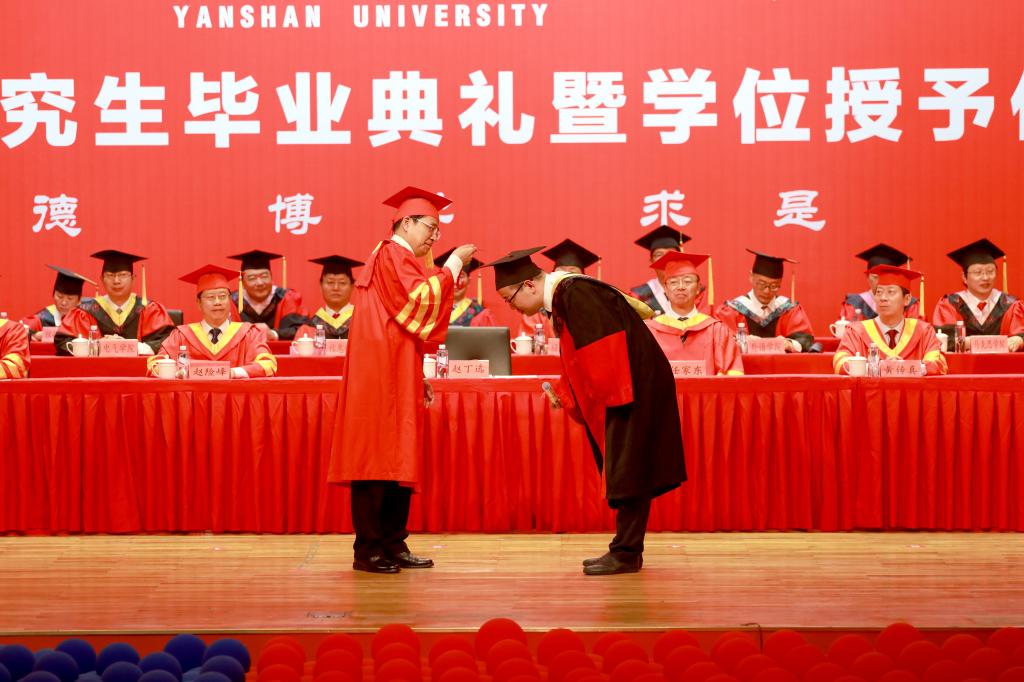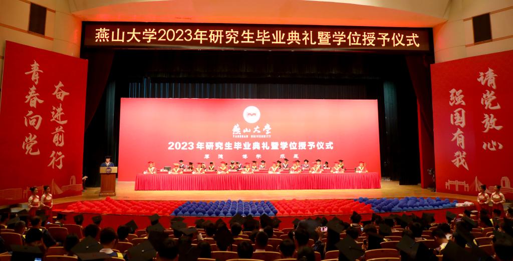 副校长任家东和王利民分别宣读了燕山大学研究生毕业文件和学位授予文件。材料科学与工程学院耿林同学代表毕业生由衷地感谢母校的悉心培养和恩师的谆谆教诲,并决心肩负起更大的责任和使命,在未来的道路上再攀高峰,为国家发展和社会进步做出积极贡献。毕业留学生代表硕士留学生李京美感谢在中国学习期间燕山大学给予她家人般的照顾和关怀,并表示将以燕山大学所倡导的家国情怀为己任,为家乡建设和中外友好交流合作做出贡献。信息科学与工程学院博士生导师李英伟教授代表研究生导师祝愿毕业生在未来的人生道路上继续努力,用智慧和汗水谱写更美的青春华章。