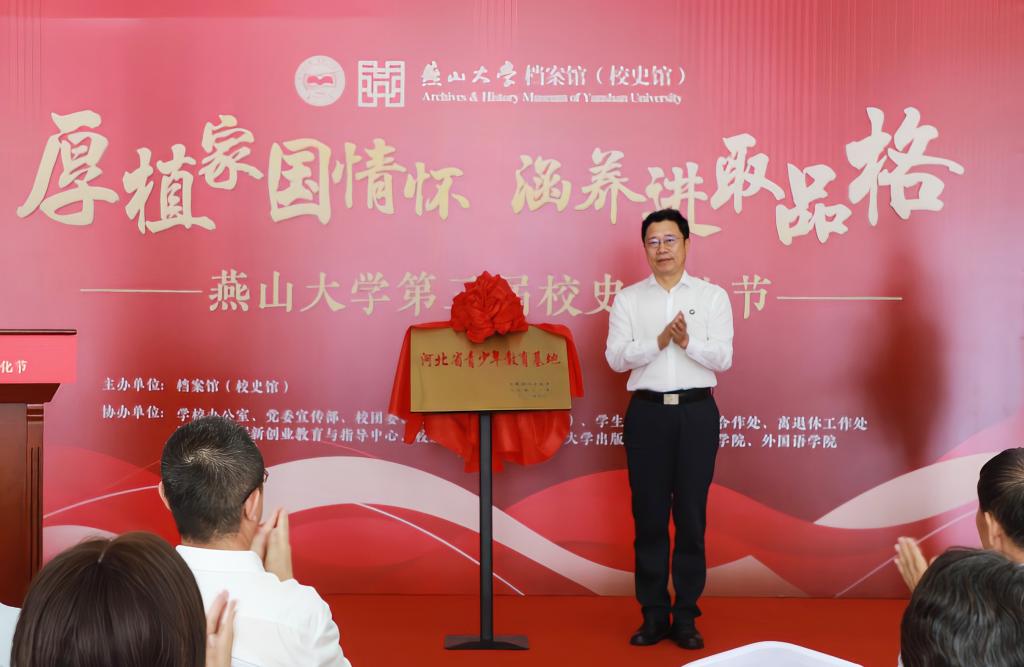 校党委书记赵险峰为河北省青少年教育基地揭牌。在热烈喜庆的气氛中,赵险峰书记宣布燕山大学第三届校史文化节开幕,将整个开幕仪式推向高潮。