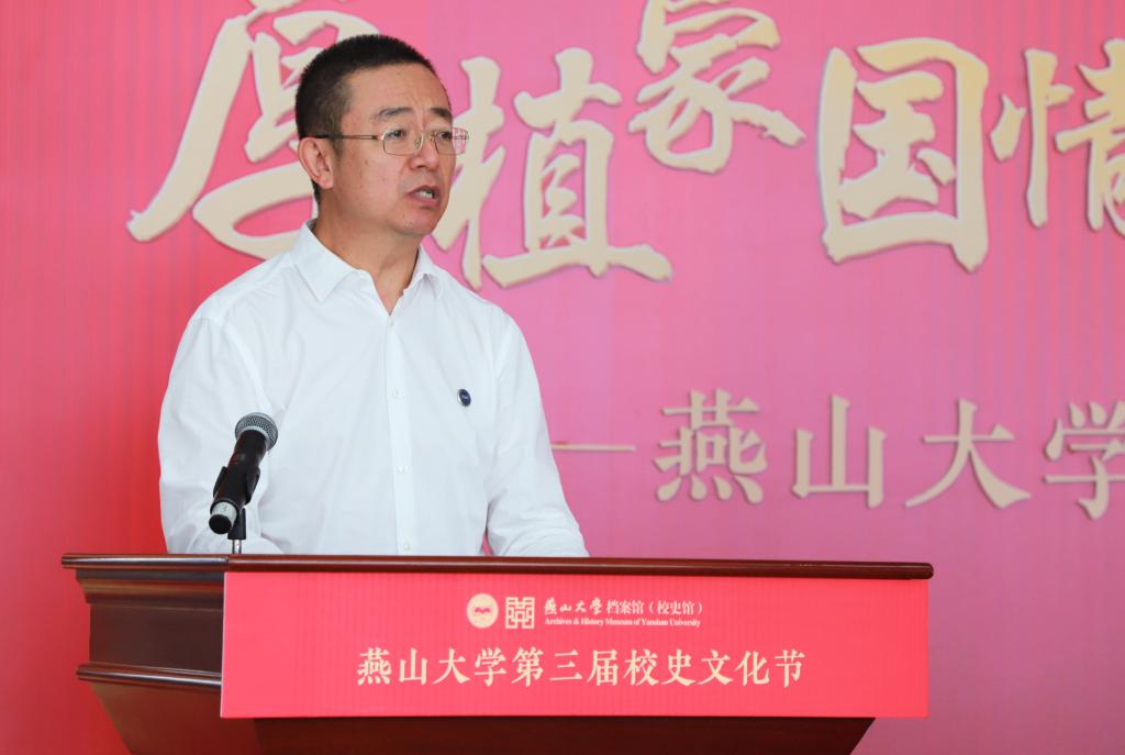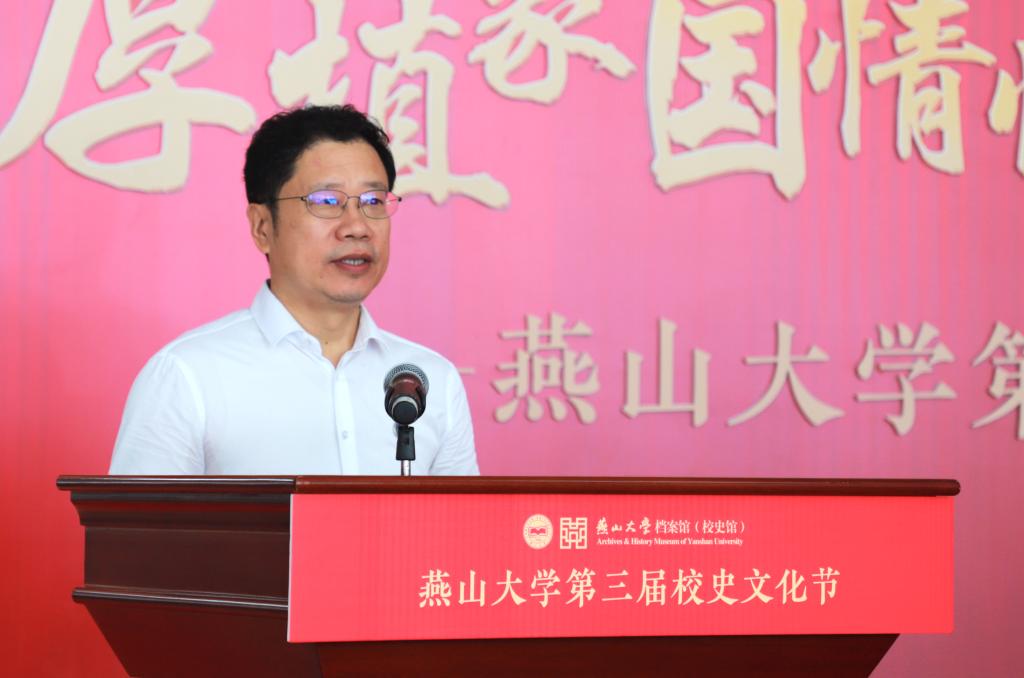任家东在致辞中向坚守初心、默默耕耘的全体校史工作者表示衷心的感谢并致以崇高的敬意。他指出,校史是学校的文脉传承,与国家民族的发展相伴而生,既凝聚着丰富的时代内涵,又具有鲜明的精神特质,是学校重要的育人源泉。燕山大学认真贯彻落实习近平总书记关于立德树人的重要论述和加强校史工作的重要指示精神,全心打造校史陈列馆、校史宣讲团、校史文化节“三位一体”的“以史育人、以文化人”新模式,在激发师生校友爱党报国荣校情怀、助力构建“多向锻造式”大思政育人格局做出了重要贡献。他希望更多燕大人通过校史文化活动了解学校可歌可泣的创业历程,从中坚定信念、汲取智慧、传递力量,让“为党育人、为国育才”的初心薪火相传,让“匠心为国铸重器、矢志不移育英才”的使命永担在肩,发扬熔铸在燕大人骨子里的奋斗基因、工匠精神、卓越品质、家国情怀,为共圆燕大强校梦和中华民族伟大复兴的中国梦不懈奋斗、勇毅前行。
