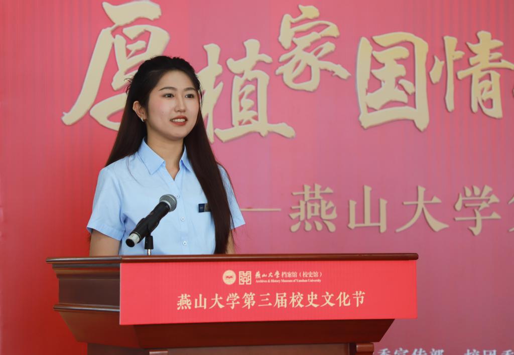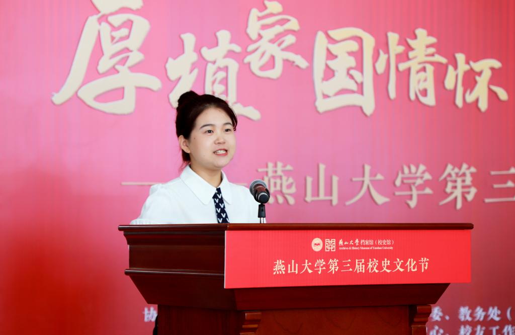 马克思主义学院2021级硕士研究生陈嘉硕代表青年学子发言。她说,习近平总书记寄语广大青年要“厚植家国情怀,涵养进取品格”,心怀家国、匠心实干为国铸器,勇担重任、矢志报国舍我其谁,就是燕大和燕大人的家国情怀;自强不息、革新求变上下求索,攻坚克难、百折不挠不懈奋斗,就是燕大和燕大人的进取品格。她号召广大燕大学子踊跃参与校史文化节活动,在追忆校史中砥砺奋进,在坚定信仰中走向未来,以优异成绩书写属于燕大和青春的故事,在强国建设、民族复兴新征程上跑出当代青年的最好成绩。