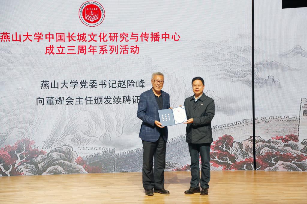 赵险峰向董耀会颁发了燕山大学中国长城文化研究与传播中心主任续聘聘书。陈国强在活动现场致辞,希望中心继续取得新业绩、创造新成果、实现新进步,为学校内涵式高质量发展发挥更加积极、更加重要的作用。燕山大学中国长城文化研究与传播中心执行主任、燕山大学出版社社长陈玉结合视频介绍了中心三年以来的发展历程。燕山大学中国长城文化研究与传播中心长城文化出版研究所所长、燕山大学出版社副社长、艺术与设计学院教授赵欣带领学生为在场观众呈现了一场古诗词与当代艺术歌曲相遇的探索之旅。