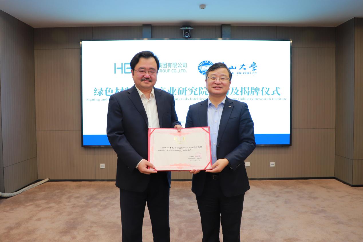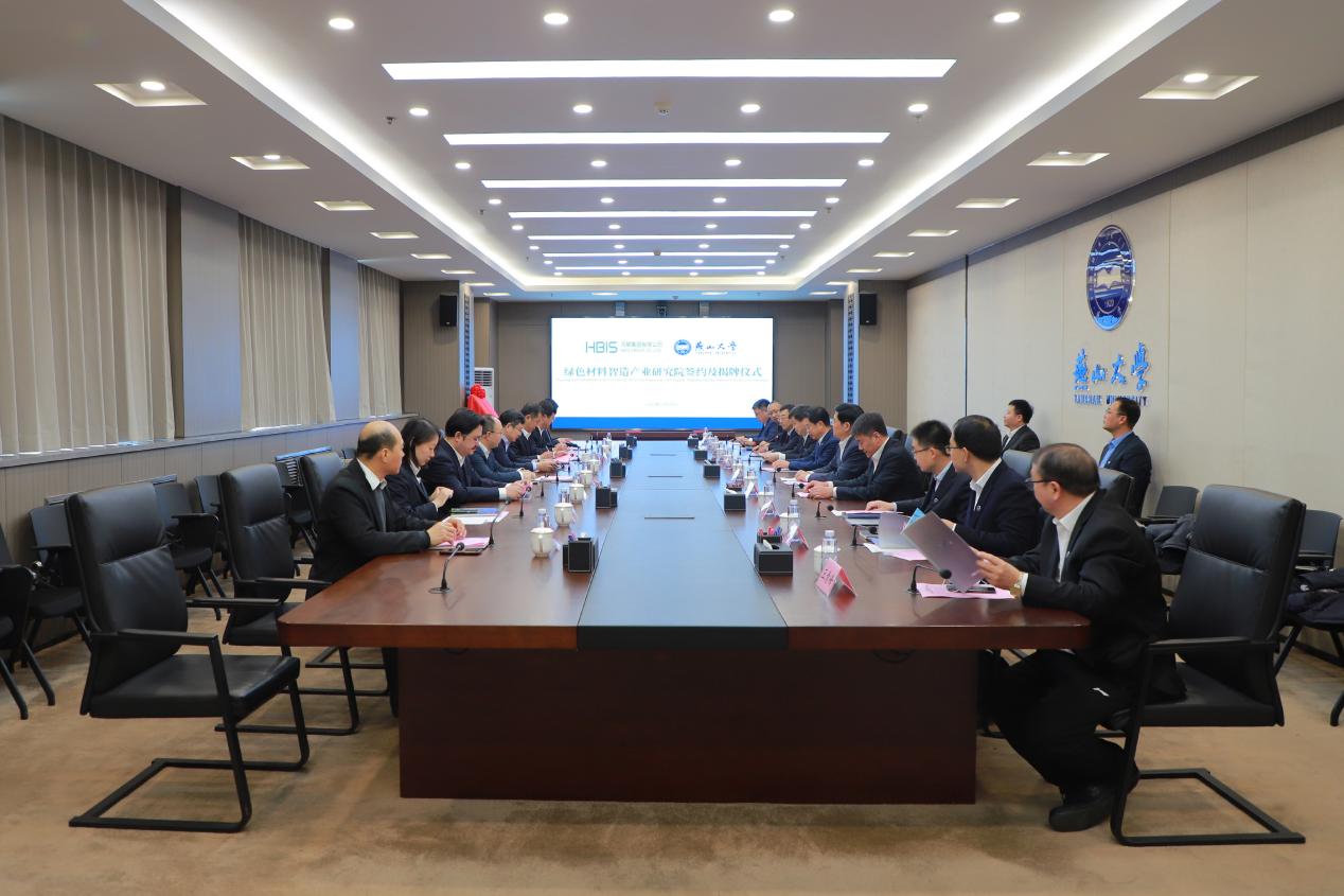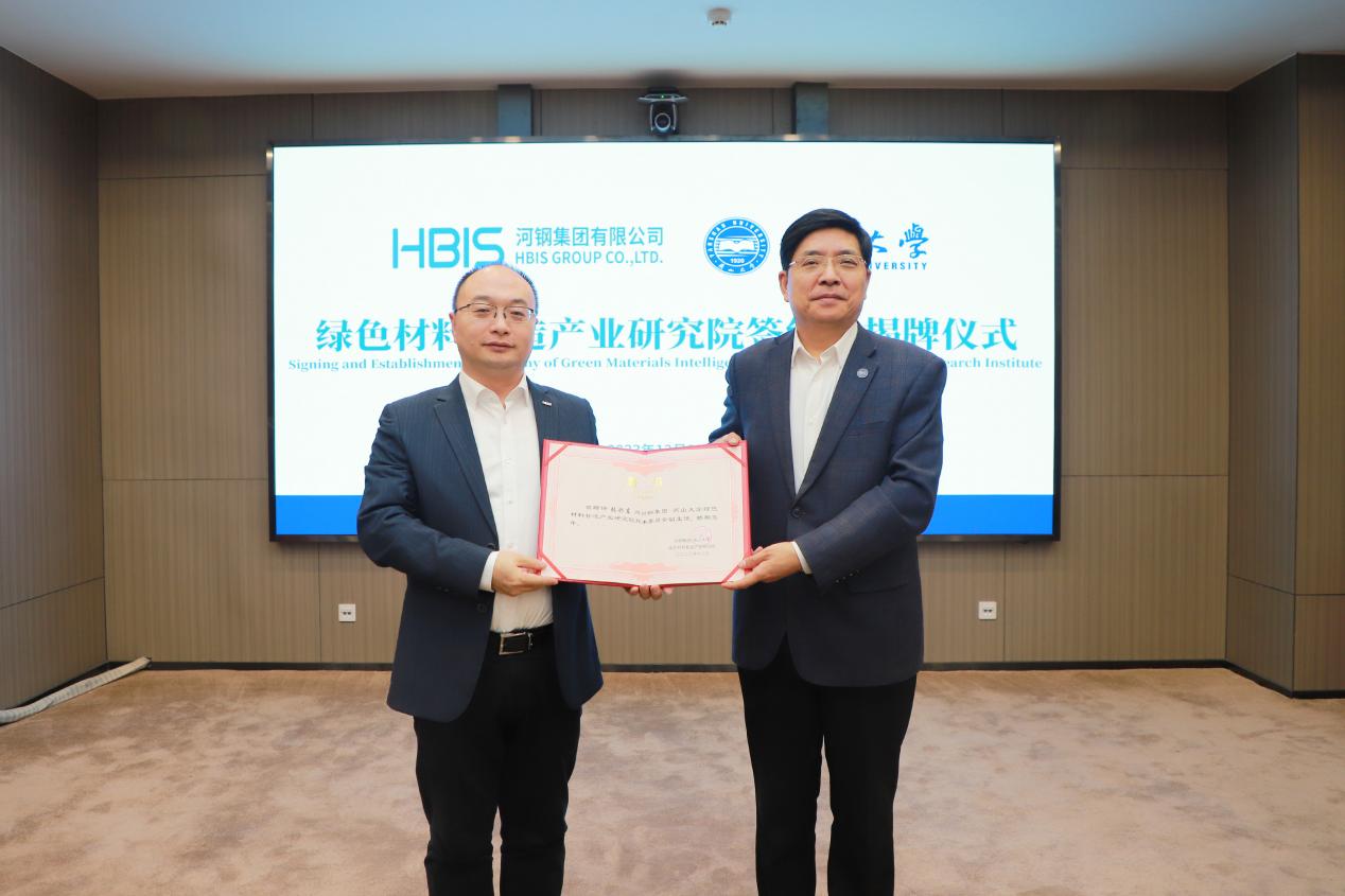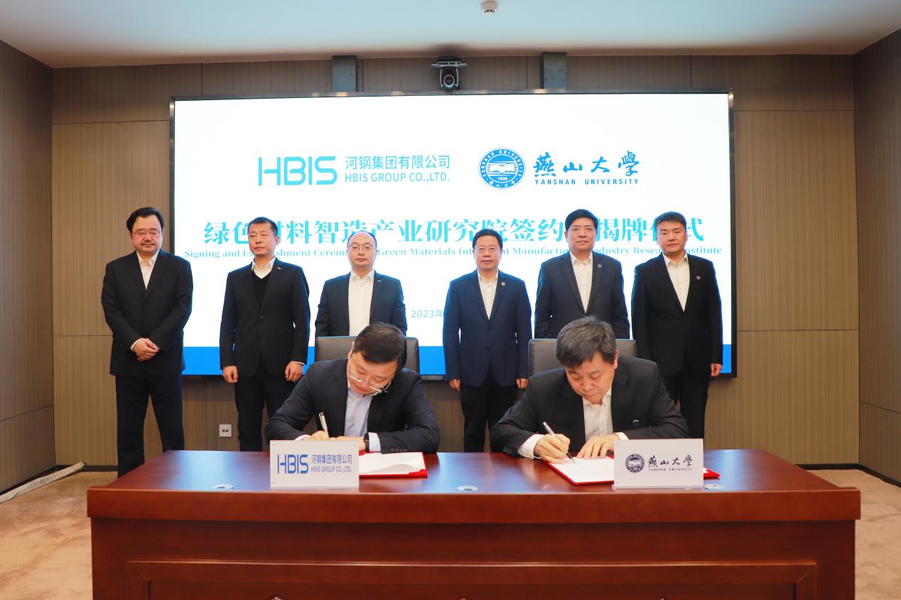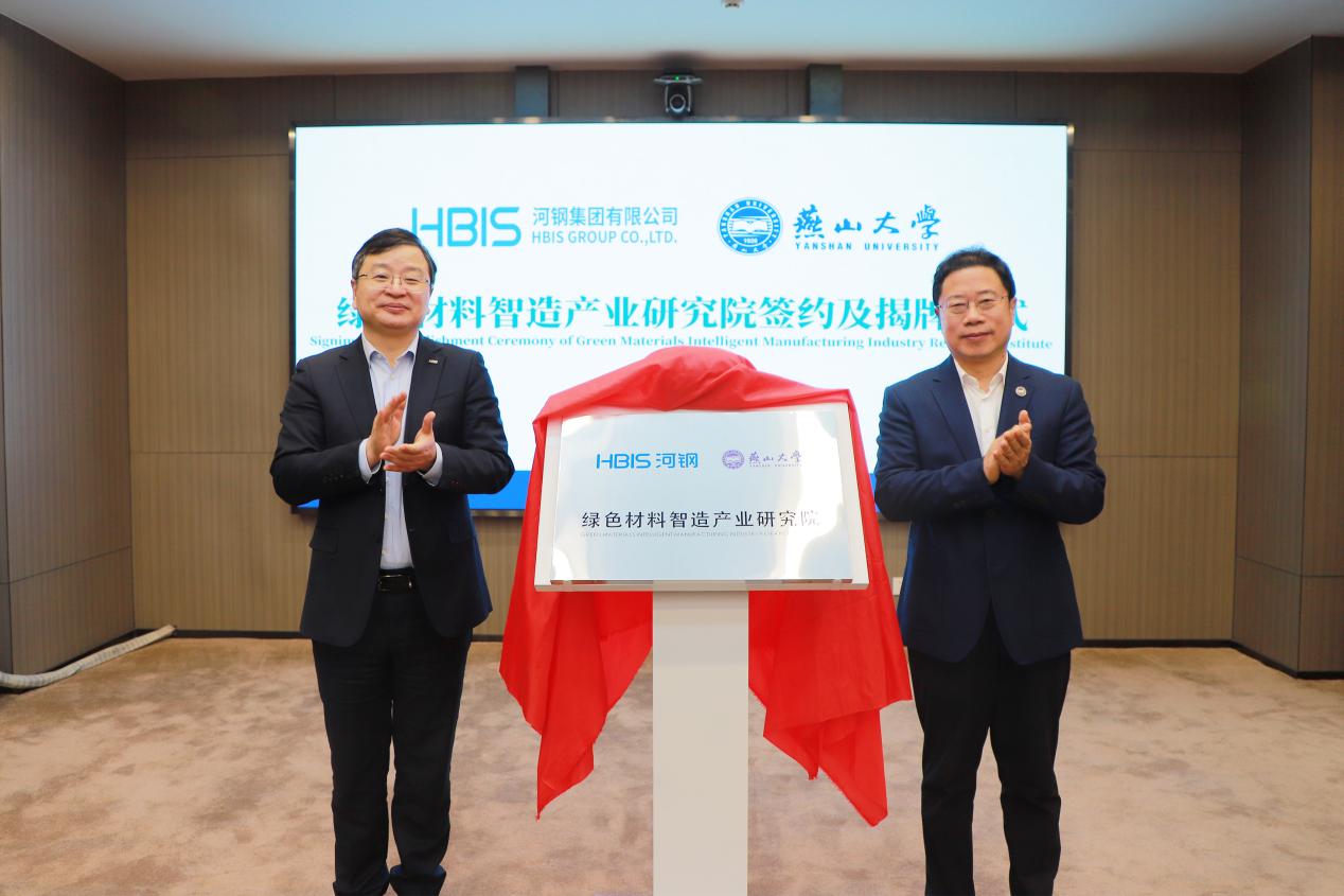 【新闻中心讯】为深入贯彻创新驱动发展战略,切实推动校企协同创新,提升钢铁产业高端化、绿色化、智能化水平,共促河北钢铁产业高质量发展,实现校企共建共享共赢,12月29日上午,河钢集团有限公司与燕山大学共建“绿色材料智造产业研究院”签约揭牌仪式暨第一次管理委员会议在燕山大学隆重举行。燕山大学党委书记赵险峰、河钢集团副总经理李毅仁共同为研究院揭牌。