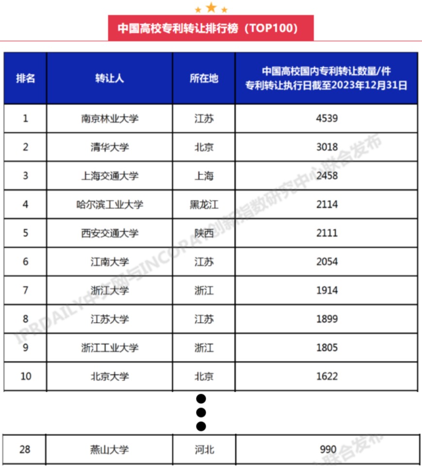 【新闻中心讯】近日,全球知识产权综合信息服务提供商IPRdaily与incoPat创新指数研究中心联合发布“中国高校专利转让排行榜(TOP100)”(以下简称“榜单”),该榜单对截至2023年12月31日,中国高校在国家知识产权局登记生效的专利申请权和专利权转让数量(不含港澳台)进行了统计分析,燕山大学以990件专利转让居全国高校排名第28位,较上次排行晋升6位,是河北省唯一入围高校。