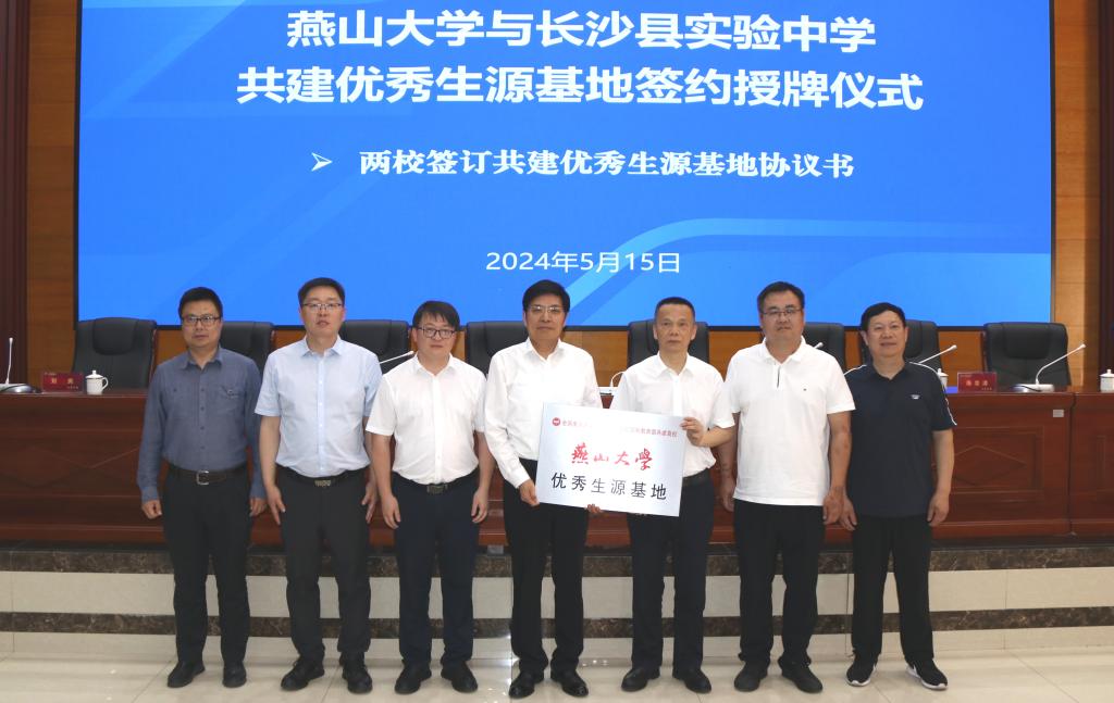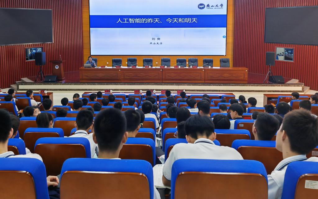 在长沙县实验中学,赵丁选一行授予中学“优秀生源基地”牌匾,并与中学领导、骨干教师进行座谈。长沙县实验中学党委书记柳国强对赵丁选一行的来访表示欢迎,他高度赞扬了燕山大学对国家和社会经济社会发展作出的贡献。赵丁选对长沙县实验中学长期以来为学校输送优秀学子给予充分肯定,并介绍了考入燕山大学学子的相关情况。他强调,优秀生源基地建设是进一步加强两校协同育人,提高学校生源质量的重要举措。在新高考改革背景下,学校积极开展优秀生源基地建设工作,走进高中、走进学生,推介学校、推介专业。通过共建优秀生源基地,以助力学生成长成才为宗旨,尽最大可能为优秀生源基地学校提供支持。学校将积极推进协同育人桥梁,创新人才培养体系建设,助力学子圆梦心仪大学。学校档案馆馆长郭沛作为两校校友代表发言,他鼓励学弟学妹们抓住良好机遇,结合个人兴趣和需求,做好人生选择。电气工程学院副院长刘爽向在场同学们作了题为《人工智能的昨天、今天和明天》的科普讲座。