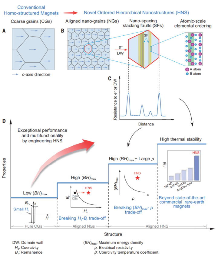 研究团队提出了一种HNS设计策略[图1]。团队采用简单的二元PrCo5合金为模型材料,通过制造丰富、有序的HNS,协同操纵了具有内在矛盾的能量密度、电阻率和磁热稳定性,破解了铁磁体中内在的多种性能冲突。采用该策略制备的HNS永磁体同时具有高的能量密度、大的电阻率和高的矫顽力热稳定性,优于现有的高温铁磁体。除了控制材料的电子输运和畴壁移动,该HNS策略还可用来控制声子传输和光传播以及反应物的传输,发展下一代多功能材料。