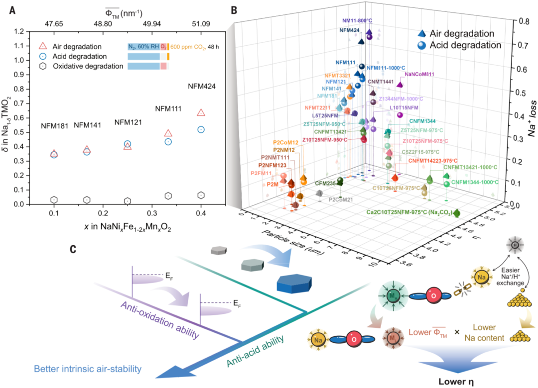 图为酸性降解和氧化降解的定量化以及本征空气稳定的钠离子层状氧化物正极材料的开发设计原则