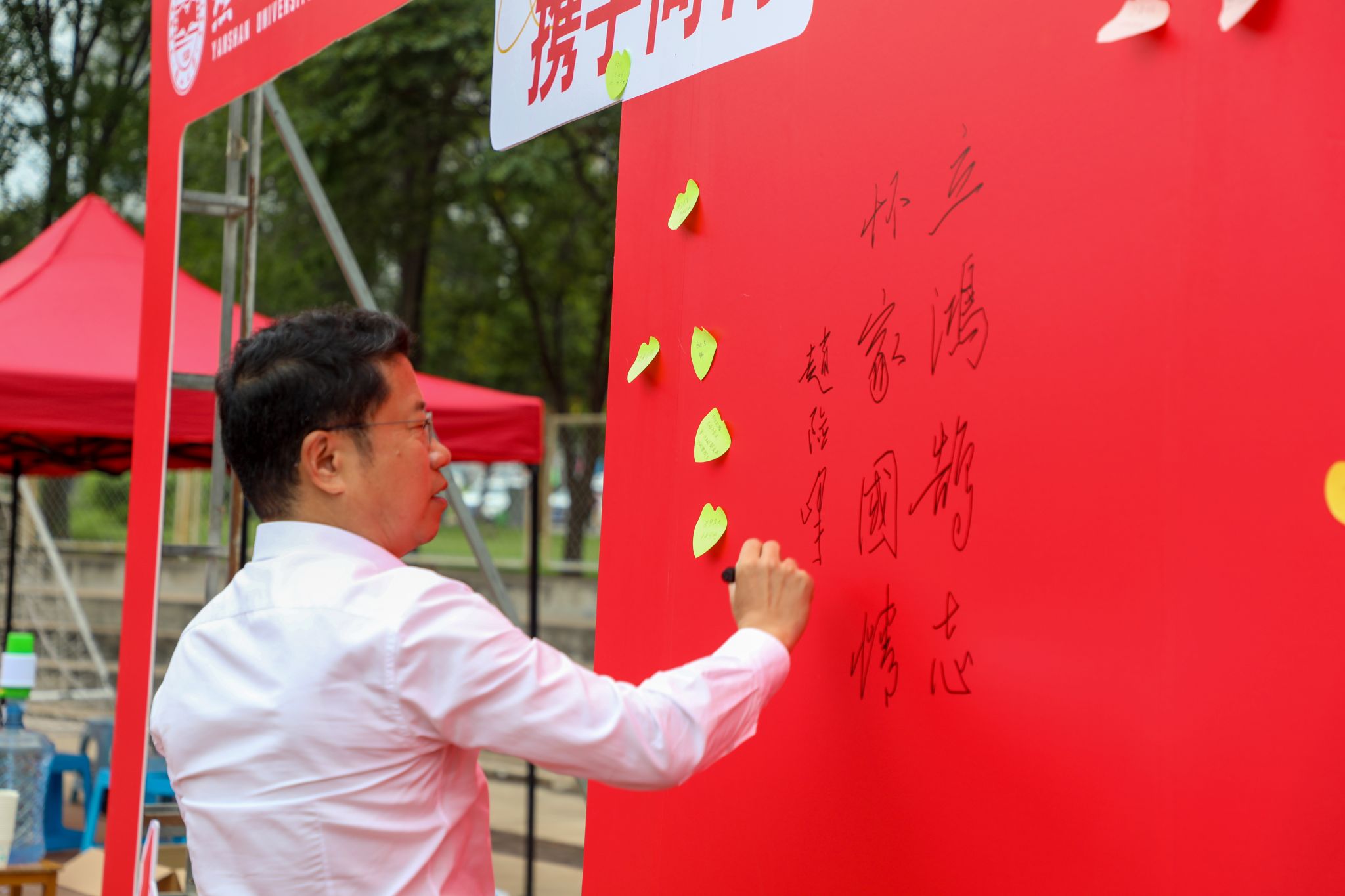 在东校区第一体育场迎新点,赵险峰题写“立鸿鹄志,怀家国情”寄语,勉励新生志存高远、脚踏实地、心系祖国、不负时代。两位领导应新生邀请,与新生和家长、迎新工作人员、学生志愿者代表合影留念。