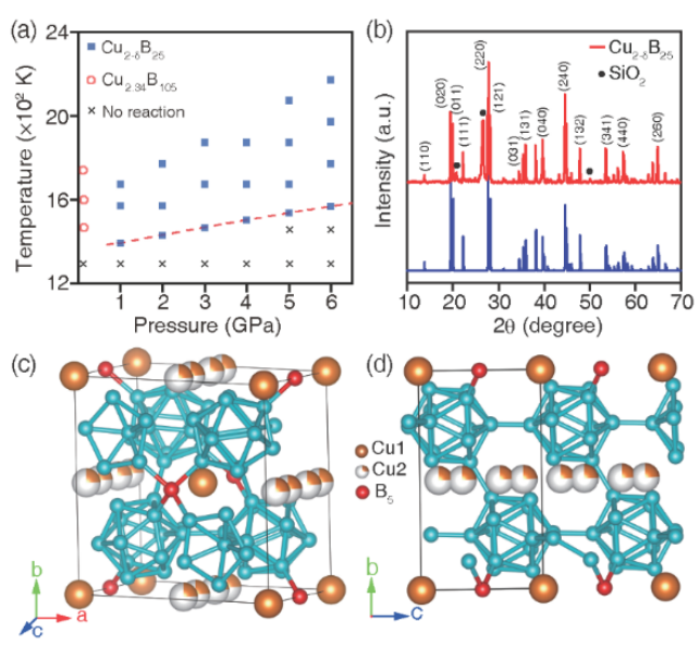图1铜硼化合物的P-T相图,XRD谱及相关晶体结构示意图