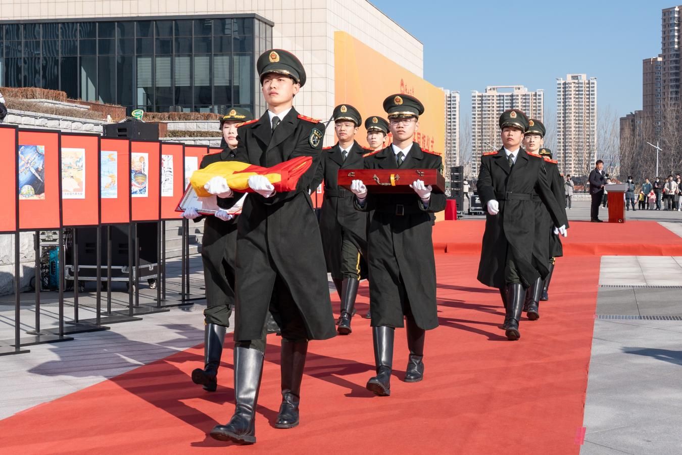 执旗手、6名护旗手沿“辉宏七五载,艺绘盛世图”庆祝新中国成立75周年绘画展正步前往主席台中央。