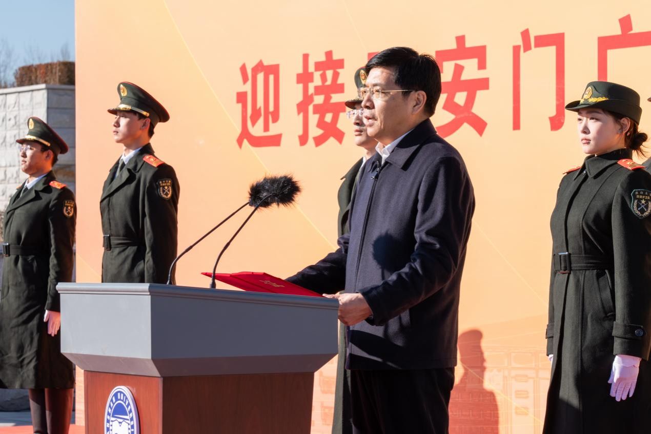 12月13日下午,赠旗仪式在北京举行。天安门地区管理委员会党组成员、副主任姚辉向我校赠送这面意义非凡的国旗,校党委常委、副校长蔡星周受党委书记赵险峰、校长赵丁选委托,代表全校师生接受赠予。管委会天安门广场管理处处长王彦荣、综合管理服务中心主任安步凯,校党委学生工作部部长薛传佳等同志参加仪式。