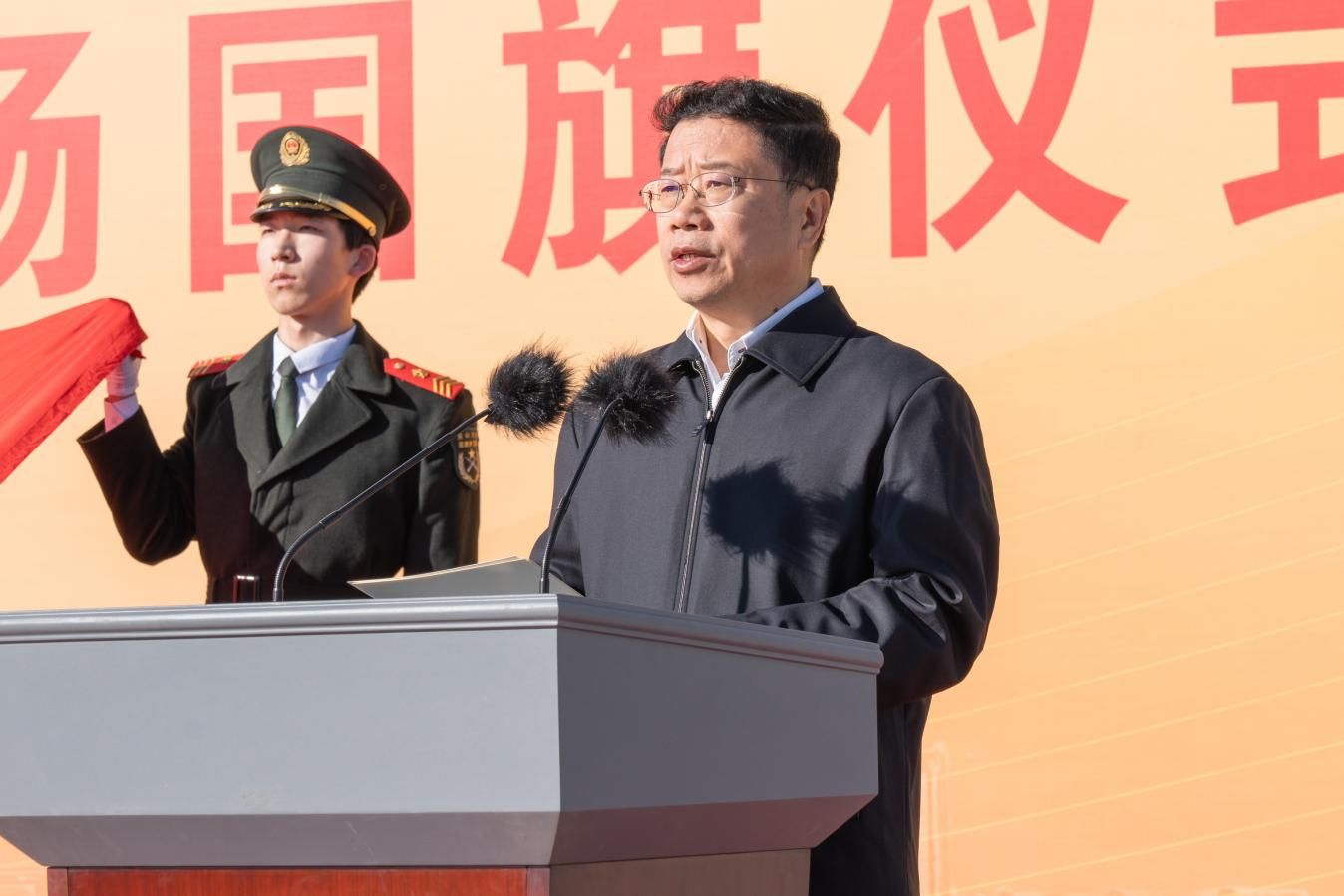 赵丁选宣读国旗赠予证书