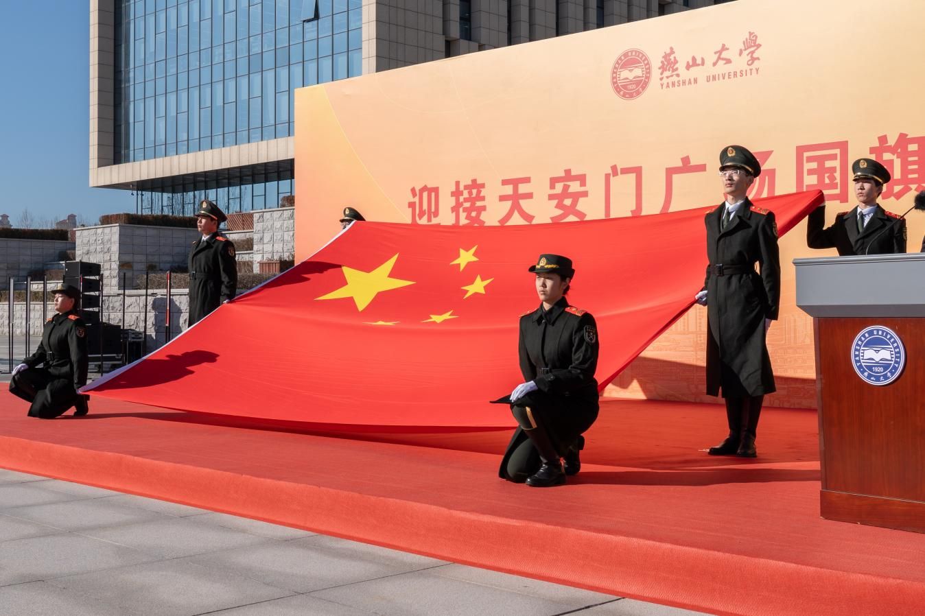 12月16日,燕山大学在西校区新图书馆门前广场隆重举行迎接天安门广场国旗仪式。学校领导,学校党群部门负责人、二级单位党委书记、各学院党委副书记、全体辅导员及学生代表共500余人共同迎旗。党委学生工作部部长薛传佳主持仪式。