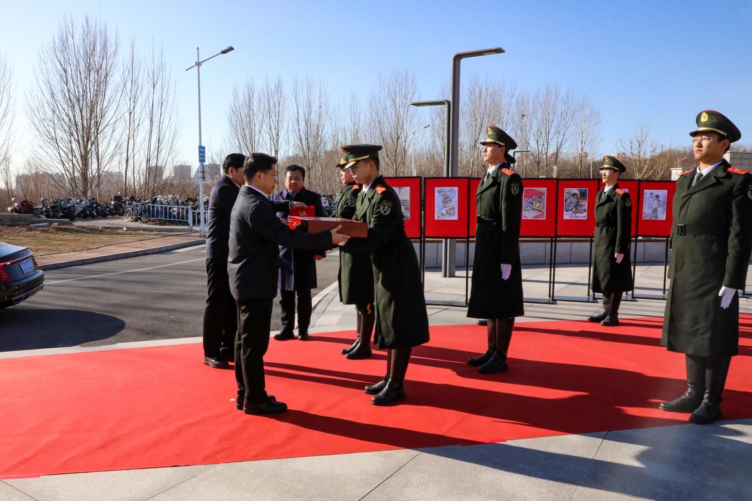 蔡星周副校长护送获赠国旗来到仪式现场。赵险峰书记、赵丁选校长将装有国旗的樟木箱及赠予证书郑重交予国旗护卫队执旗手。