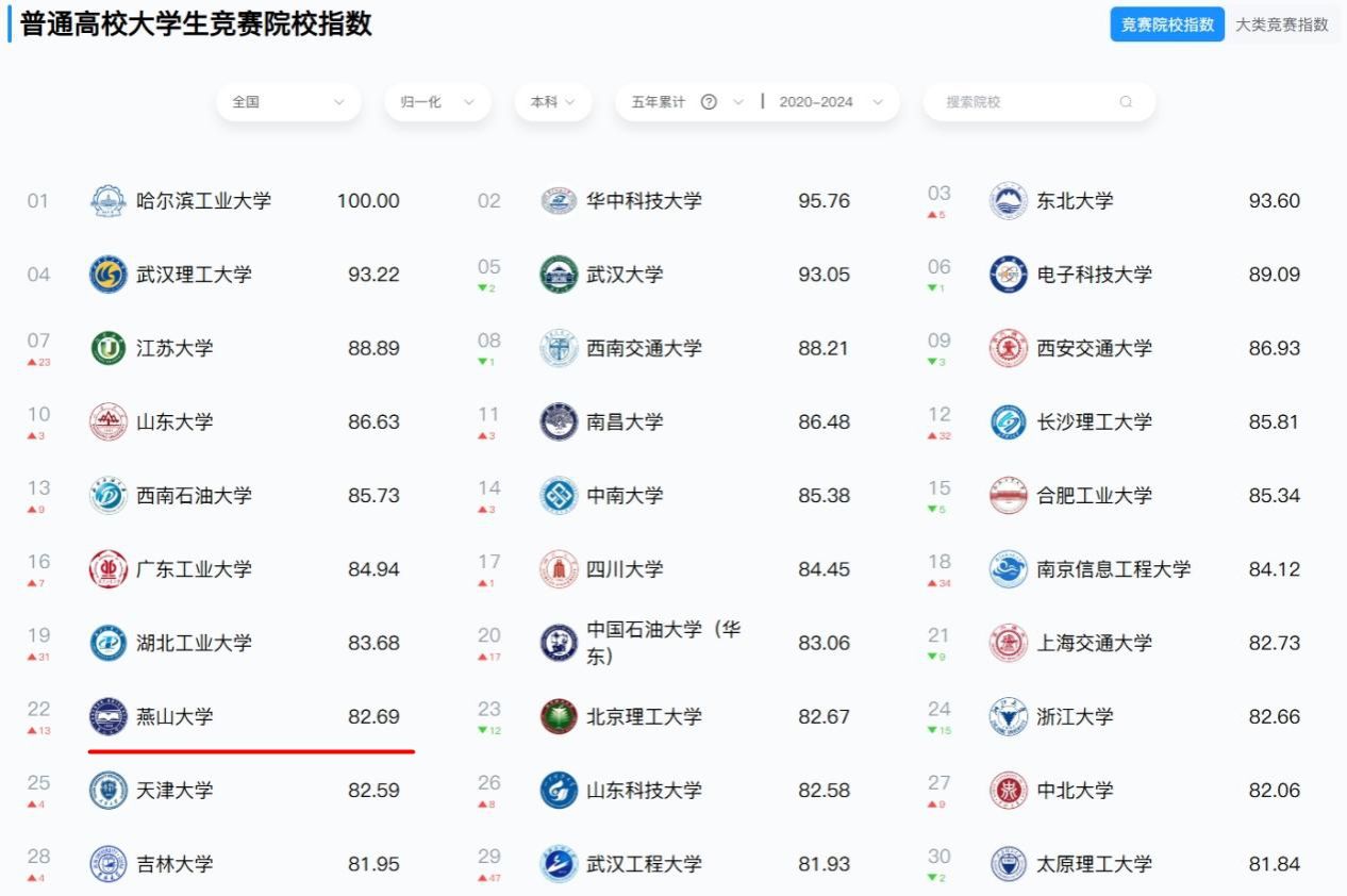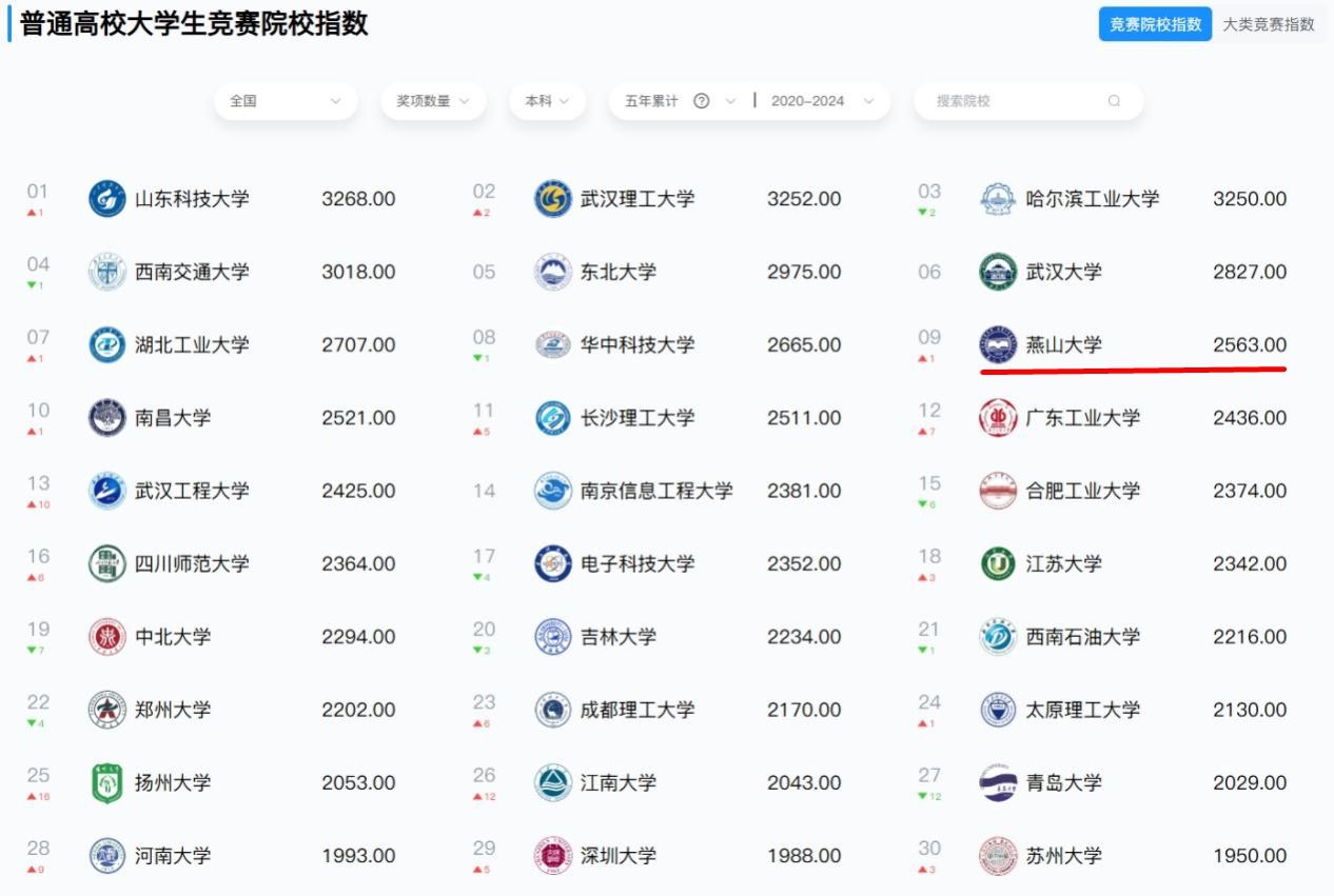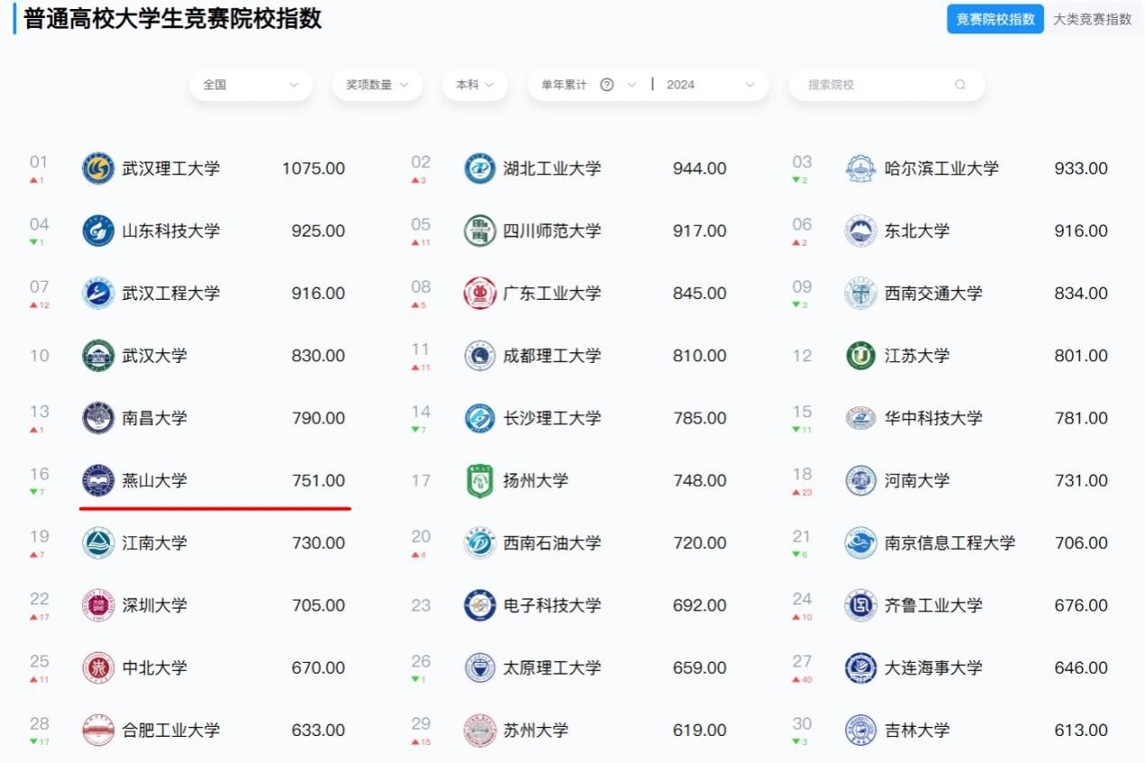 燕山大学在2024年普通高校大学生竞赛院校指数排名中创造佳绩