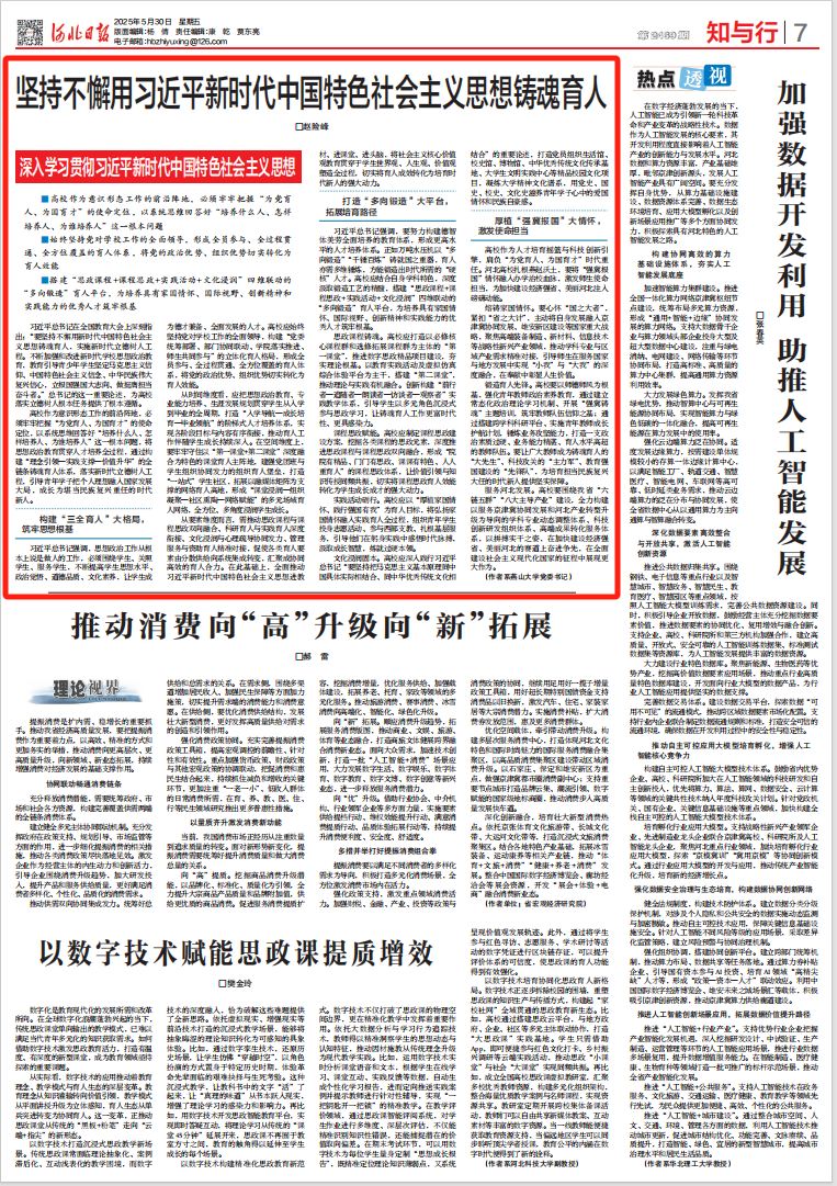 【新闻中心讯】5月30日,《河北日报》“知与行”专版刊发了燕山大学党委书记赵险峰的署名文章《坚持不懈用习近平新时代中国特色社会主义思想铸魂育人》。文章聚焦以系统思维回答好“培养什么人、怎样培养人、为谁培养人”这一根本问题,从构建“三全育人”格局、打造“多向锻造”平台、厚植“强冀报国”情怀三大维度,系统阐述了新时代高校铸魂育人的实践路径。通过构建“理念引领—实践支撑—价值升华”的全链条铸魂育人体系,落实新时代立德树人工程,引导青年学子把个人理想融入国家发展大局,成长为堪当民族复兴重任的时代新人。该文章为高校落实习近平总书记关于立德树人的重要论述提供了实践范本,彰显了燕山大学扎根燕赵大地、培育时代新人的责任担当,为新时代高等教育高质量发展提供了有益借鉴。