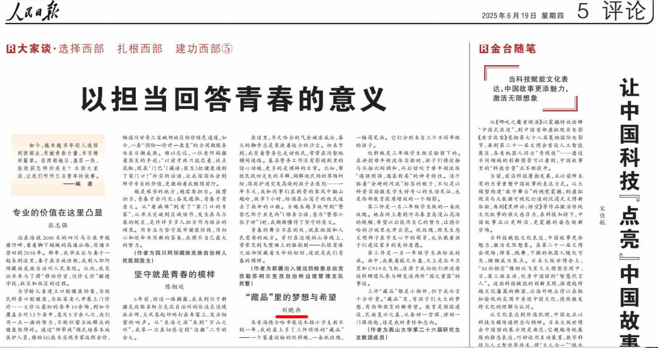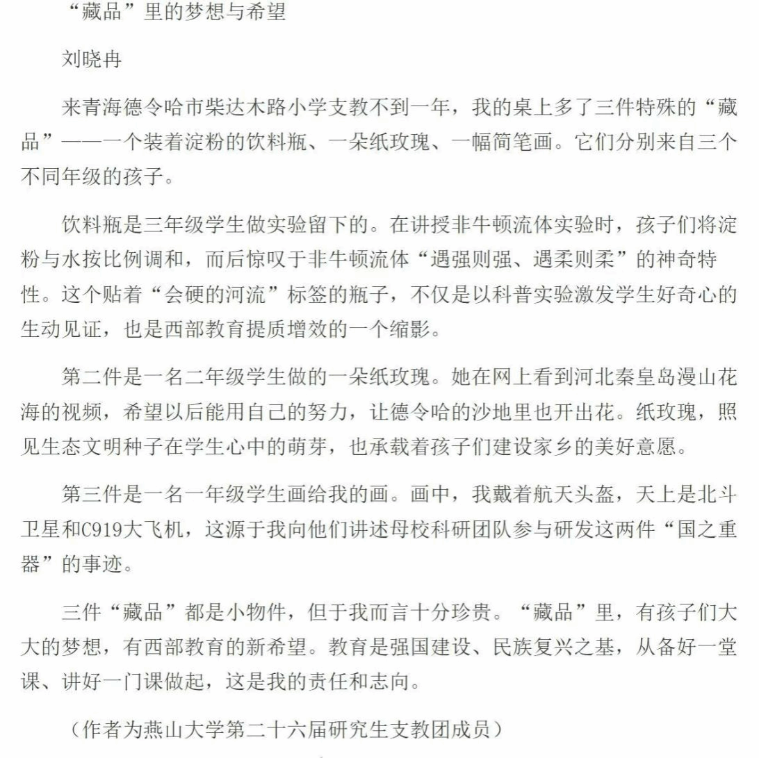 【新闻中心讯】6月19日,一篇题为《“藏品”里的梦想与希望》的文章在《人民日报》上刊发。文章聚焦燕山大学第26届研究生支教团成员刘晓冉的支教故事,通过讲述其在支教服务期间的真实经历与深刻感悟,生动诠释了新时代燕大青年主动投身西部建设、贡献青春力量的使命担当与赤诚情怀,为高校开展青年实践育人工作树立了典范、提供了鲜活范例。
