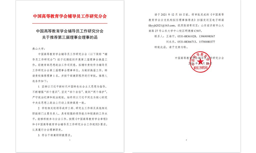 【新闻中心讯】日前,经中国高等教育学会辅导员工作研究分会审议,经教育部思想政治工作司同意,燕山大学获批成为中国高等教育学会辅导员工作研究分会理事单位,填补我校此项目上的空白。