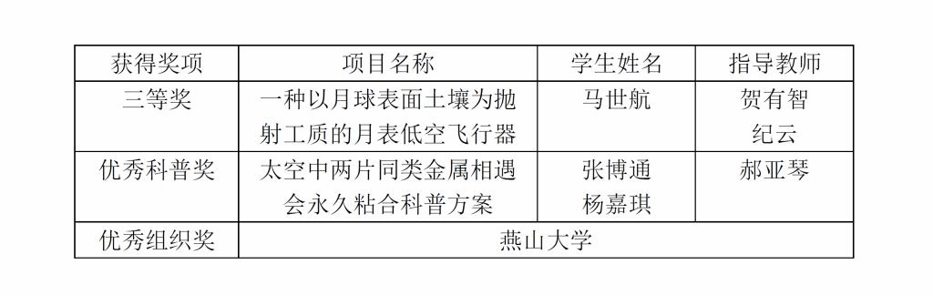 本次活动由国家航天局联合教育部、科技部、中科院、共青团中央、中国科协和国家自然科学基金委共同举办。自发布比赛通知以来,我校积极响组织筹备,共有21项学生作品参与申报,经过专家网评、组织汇评等多轮角逐,我校学生作品《一种以月球表面土壤为抛射工质的月表低空飞行器》基于嫦娥六号月球样本采集研究,根据其土壤性质等多方面展开月表低空飞行器研究荣获比赛三等奖;学生作品《太空中两片同类金属相遇会永久粘合的科普方案》从同类金属的属性在太空无氧环境下的变化进行导入科普,荣获比赛优秀科普奖。