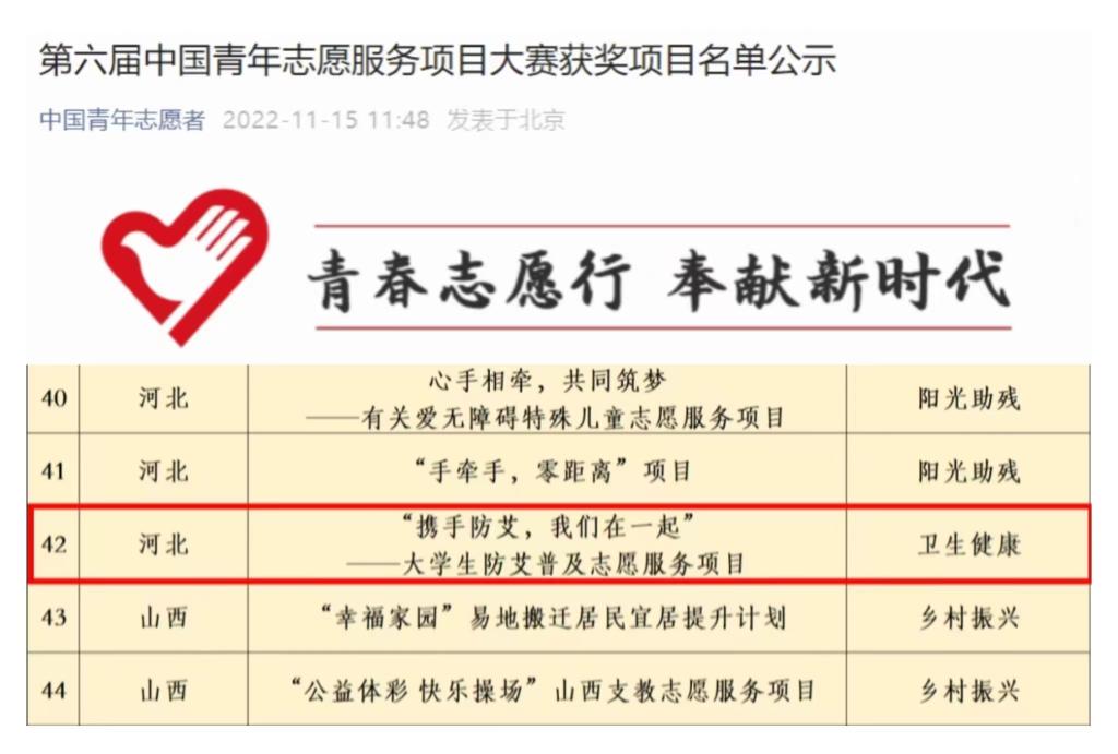【新闻中心讯】近日,由共青团中央、中央文明办等单位联合举办的第六届中国青年志愿服务项目大赛落下帷幕,我校《携手防艾,我们在一起——大学生防艾普及志愿服务项目》荣获铜奖,这是我校第一次进入国赛并获奖。