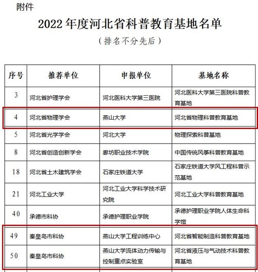 【新闻中心讯】近日,河北省科学技术协会发布《关于命名2022年度河北省科普教育基地的通知》,经过单位申报、初评与推荐、专家评审等环节,依托燕山大学建设的“河北省物理科普教育基地”、“河北省智能制造科普教育基地”和“河北省液压与气动技术科普教育基地”列入河北省科普教育基地。本次评选,全省共有13个高校类科普教育基地通过评审。