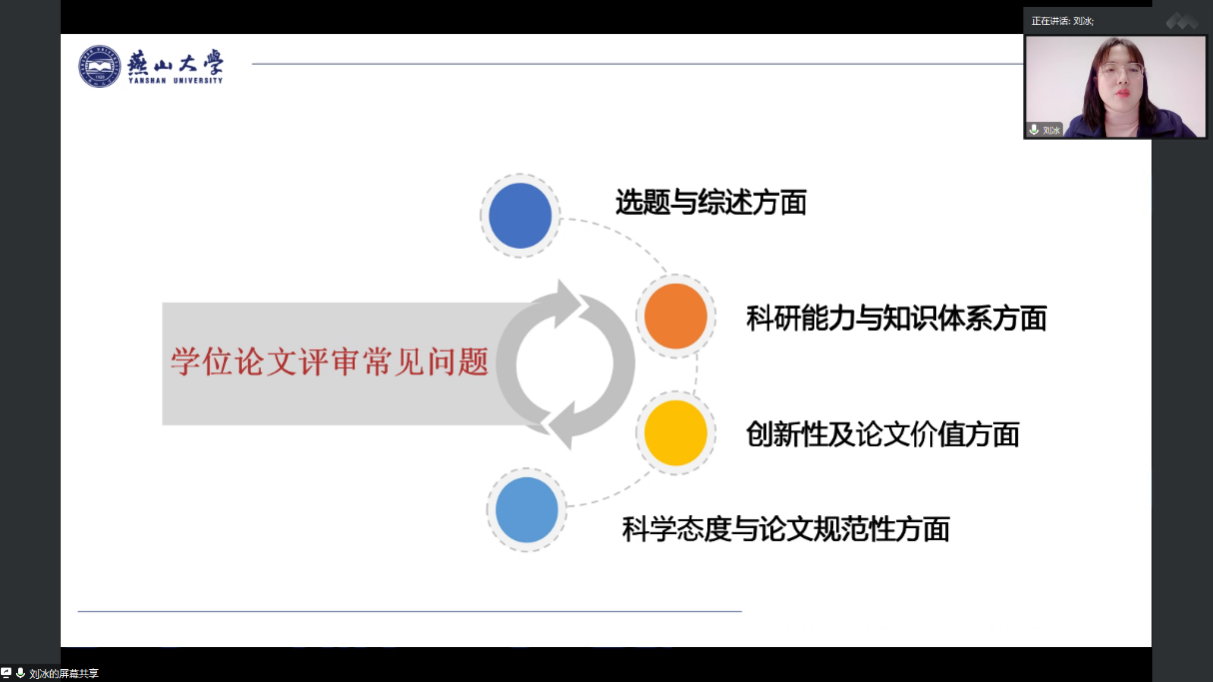 刘冰副编审根据《燕山大学研究生学位论文撰写规范》,结合具体示例,详细讲解了学位论文的前置、主体、参考文献、附录及结论等五大基本组成部分和具体要求,并针对我校近年学位论文评审中的常见问题,从选题与综述、科研能力与知识体系、创新性及论文价值以及科学态度与论文规范性方面,为同学们进行了深入的问题剖析和规范性讲解。最后,刘冰副编审详细解析了我校研究生学位论文检测规范和“知网”乐竞体育在线检测指标,她呼吁同学们进一步提高乐竞体育在线自律意识,规范性地开展乐竞体育在线研究成果发表。