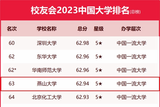 【新闻中心讯】4月6日,全国第三方大学评价机构艾瑞深校友会网正式发布《校友会2023中国大学排名:高考志愿填报指南》。我校居校友会中国大学排名(主榜)第63位,比去年上升1位,星级排名为5星级,办学层次为中国一流大学。