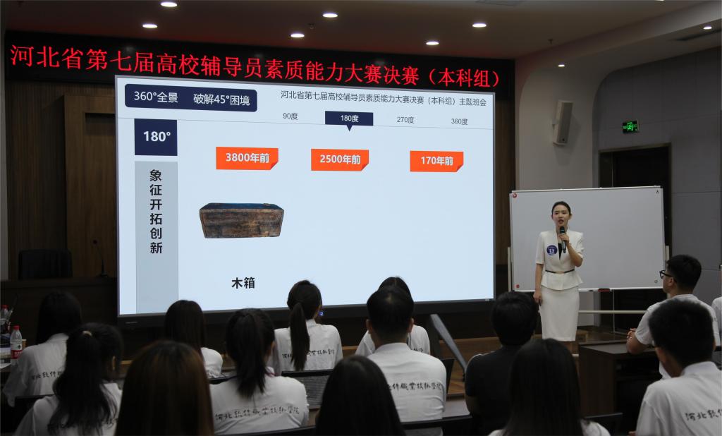 河北省高校辅导员素质能力大赛每两年举办一次,是河北省辅导员系统的最高级别赛事,由河北省委教育工委、河北省教育厅主办,本次大赛在保定举行,由高校思想政治工作队伍培训研修中心(河北师范大学)、河北软件职业技术学院承办。本次大赛共设置基础知识、班情熟知、主题班会、案例研讨、谈心谈话等5个比赛项目,其中,基础知识和班情熟知项目所有选手全部参加,主题班会、案例研讨和谈心谈话三个项目每人参与一项。本届大赛,共有来自全省50所本科高校的150名辅导员参加,评选出团体特等奖3个,一等奖10个,二等奖15个,三等奖22个,单项奖20个。