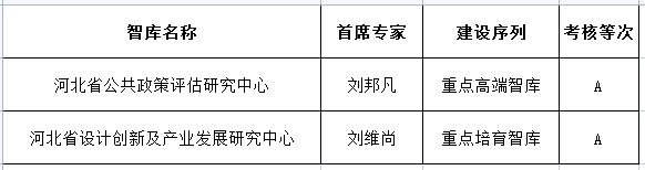 【新闻中心讯】近日,河北省新型智库理事会发布了2022年度河北省新型智库考核结果的通报,我校两家新型智库“河北省公共政策评估研究中心”和“河北省设计创新及产业发展研究中心”均获得A等次。
