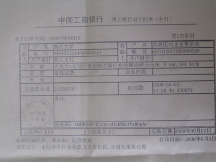 目前,我校的“特殊团费”总金额166344.5元已经汇至共青团河北省委员会,帐户名:共青团河北省委员会,帐号:637012021000000399,开户行:石家庄商业银行金桥支行。(编辑 朱可嘉 韩晋丽)